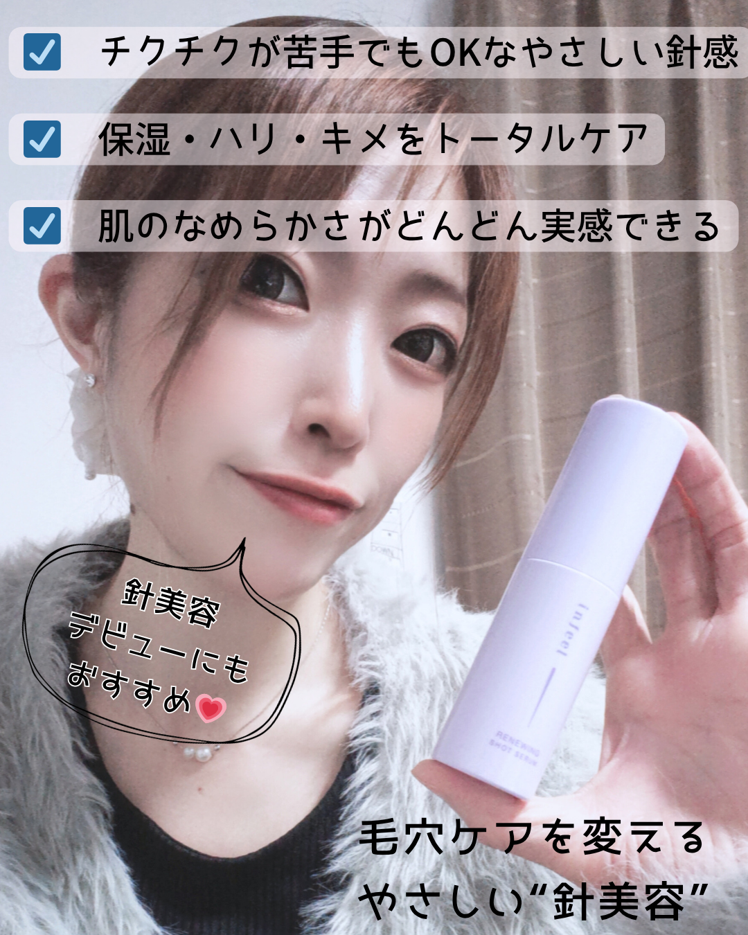 毛穴の開きやざらつきが気になって、 “針美容液”というワードに惹かれて infeelのリニューイングショットセラムを試してみました💎 約75万本の針*¹が入っているのに、 チクチク感はほとんどなくてマイルド✨ 肌になじませるほど、うるおいとハリを感じます。 バクチオール⁷やセラミド⁸、パンテノール*⁷配合で 毛穴ケアだけじゃなく、乾燥やハリ不足にも◎ 毎日のスキンケアにプラスして、 なめらかな肌印象を目指しています💠 #PR #ロゼット株式会社 #ロゼット #rosette #infeel #リニューイングショットセラム #毛穴 #インフィール #monipla #rosette_fan