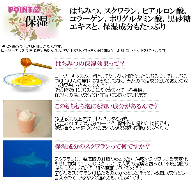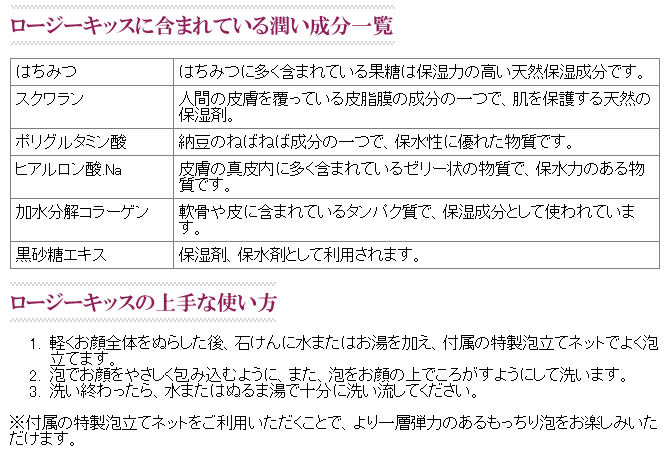 敏感できめの細かいお肌の洗顔には、自然系の素材で作ったやさしい石けんにこだわりたい。「ロージーキッス」はあなたの大切なお肌を優しく洗ってくれる自然派の石けんです。 保湿成分として天然のはちみつをぜいたくに配合。さらにスクワランやヒアルロン酸、コラーゲンなど、今評判の保湿成分をたくさん配合することで、お肌をかさつきからしっかり守ります。 そして洗い上がりにやさしく漂うのは、天然野ばらの清楚な香り。香りにも自然香料「天然野ばら」にこだわりました。 ■バラの香りの化粧石けん「ロージーキッス」 90g ・販売価格:1,980円 (消費税込) ・特性泡立てネット付き