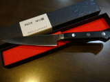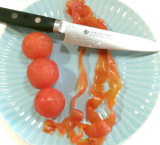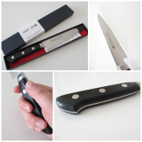 当選品の【SAKAI OWL】イノックス ペティ 120mmは持ってみると心地の良い重みを感じ、トマトを切ってみるとスパッと切れ味も良好。普段使いに最適な包丁。ちなみに食洗機対応というのも嬉しいポイント。