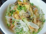 特徴はさぬきのかけうどんだし(あっさり海鮮系スープ)でお召上がりいただく、さっぱり味。