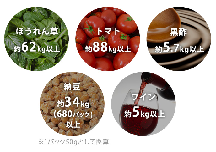 アラプラス 糖ダウンは1日分で、ほうれん草約62kg、トマト約88kg、黒酢約5.7kg、