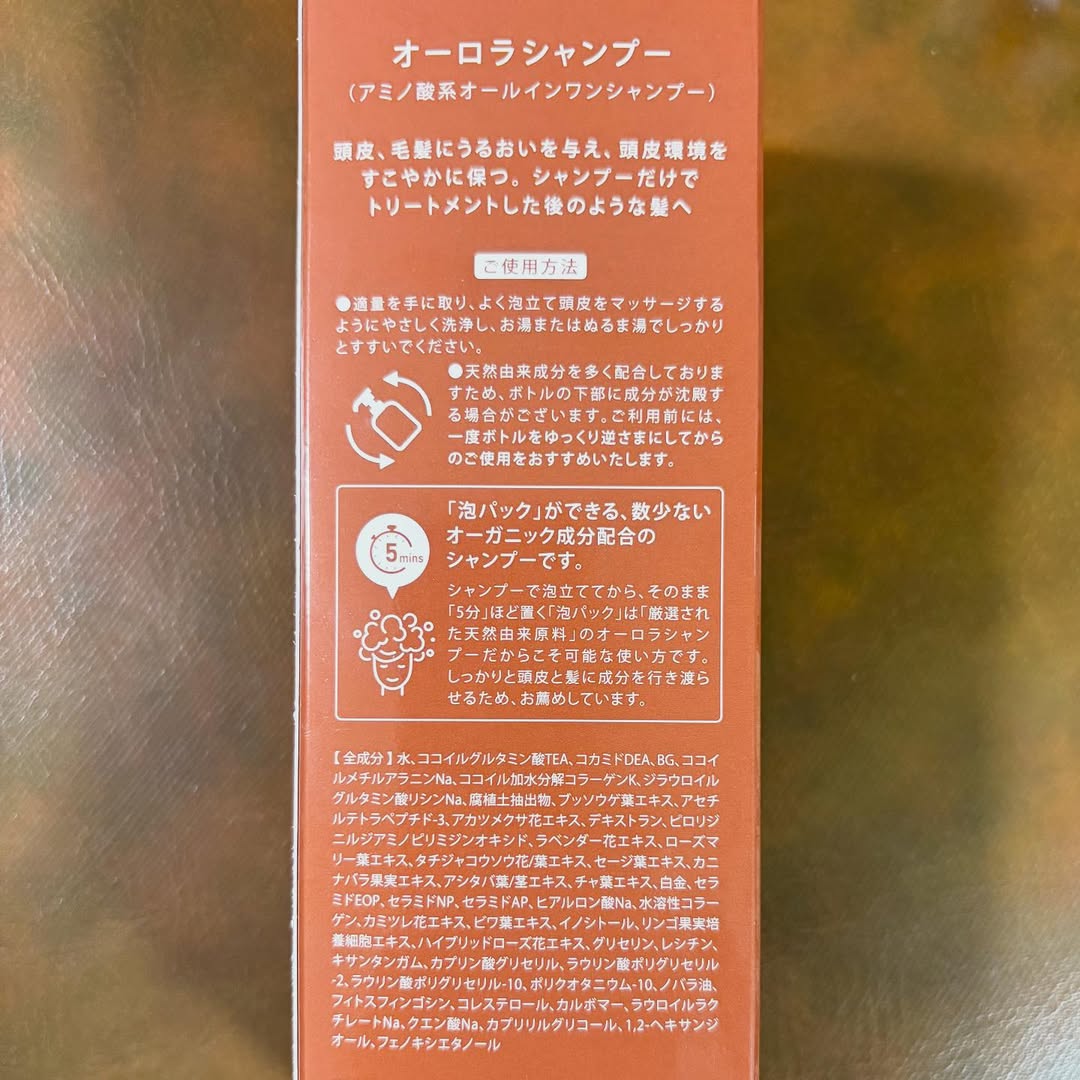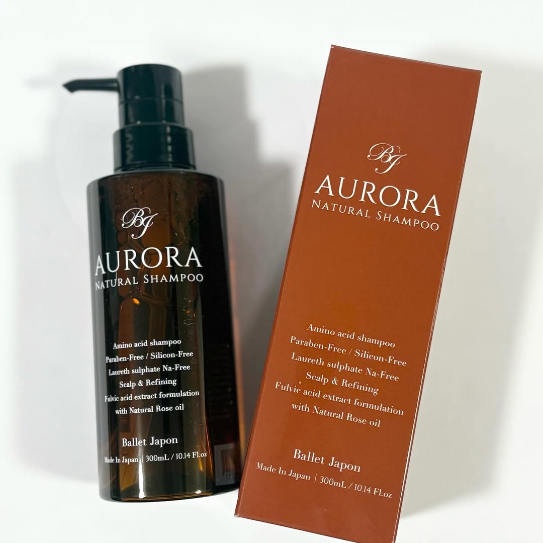 バレリーナの髪悩みから生まれたスカルプケアができるオーロラシャンプー。アミノ酸系の洗浄成分、フルボ酸エキス・セラミド・ヒアルロン酸・植物エキスなどの保湿・補修成分を配合しており髪と頭皮の両方をやさしくケアしてくれます。
