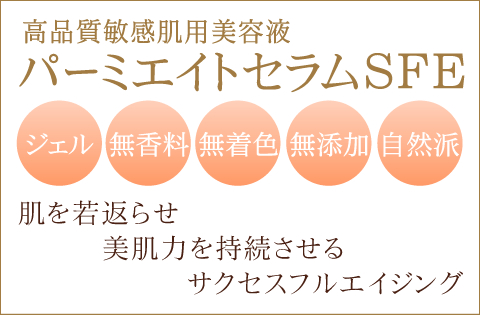 「肌年齢はいつも10歳年下」をテーマに開発したのが、化粧品ビューレの美容液「パーミエイトセラムSFE」です。主成分の「フラーレン」は老化の元凶である活性酸素を消去しメラニンの沈着を防ぎます。もう一つの主成分「チトカタライザー(酵母)」は、肌細胞の再生・活性に働きます。その結果シミ・シワ・タルミ等を改善し、潤いのあるお肌を造ります。