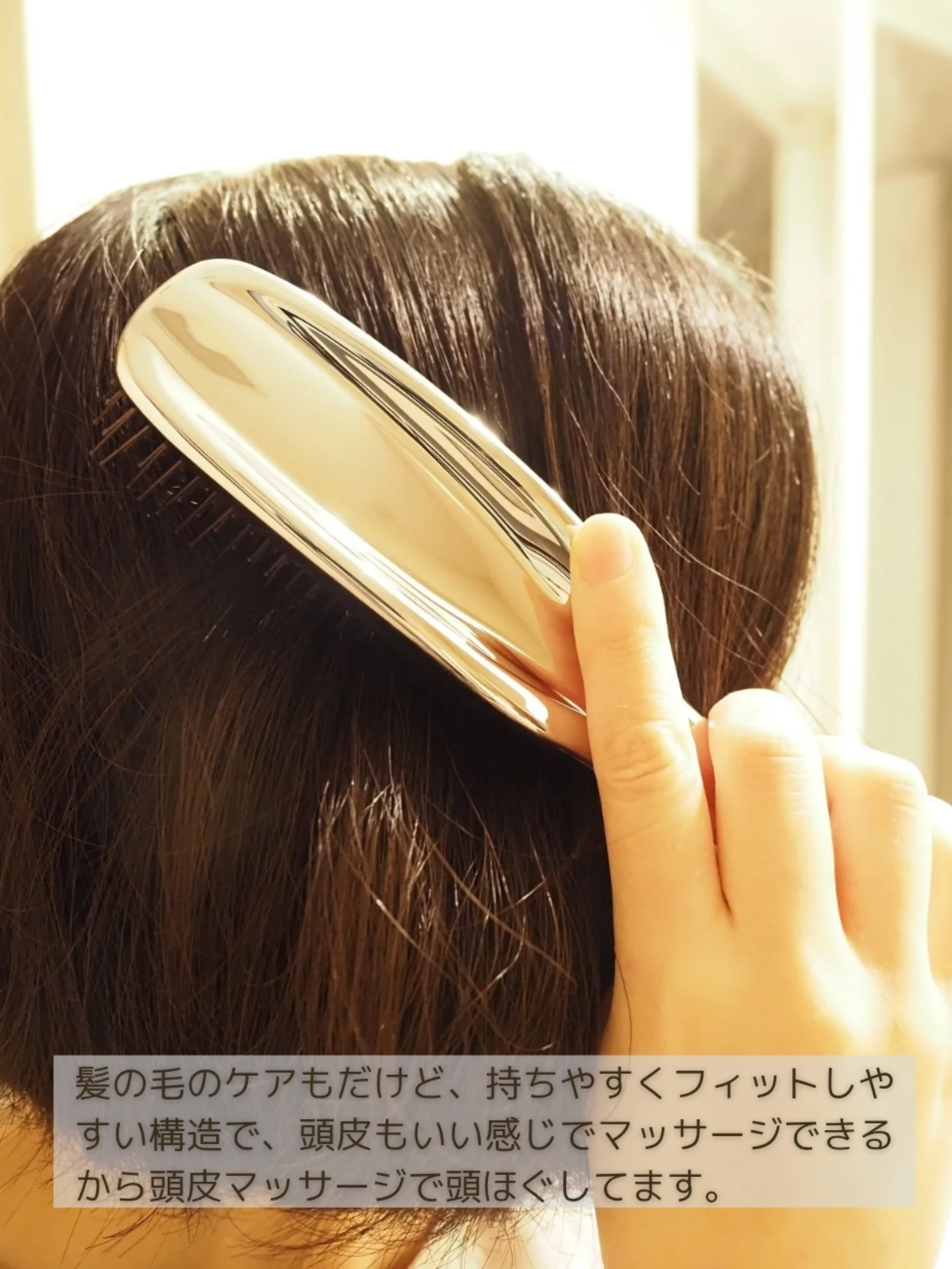 こんな頭皮や髪の毛のお悩みない? ✓ 頭皮のニオイが気になる… ✓ 髪の毛が乾燥してキシキシする… ✓ ネイルをしていてシャンプーがしっかりできない… ✓ ブラシでシャンプーするのは興味あり そうしたらこのヘアブラシ、合うかも! @shearts.brush のスカルプブラシ「クロム」 このブラシは、乾いた状態の髪の毛はもちろん、 インバスで濡れた状態でも使えるので シャンプーやトリートメントのときにも活用できる。 これから静電気がでやすい時期に気になるポイントだけど、 クロムは静電気防止に特化。 そして、日本製のブラシで、 軽くてサイズ感も手にフィットしやすい持ちやすさ。 頭皮密着構造がブラッシングのしやすさの秘訣なのかな。 私は特に仕事してると 夕方以降になると頭のコリがひどくなるの。 頭が凝ると、頭痛くなったりするから 頭ほぐしたいんだけど、 自分で頭をマッサージするのはうまくできなくて。 ところが、これで髪の毛ブラッシングしつつ 頭皮もいい感じでマッサージできるから 髪の毛のケアもそうだけど 頭皮マッサージで1日の終わりをリセットできるのが 最近の自分へのプチご褒美です。 基本的な使い方としておすすめされているのは ・シャンプー前に軽くブラッシング ↓ ・髪全体にシャンプーを行きわたらせる ↓ ・手でシャンプーしたあとにブラシを使って 頭頂部に向かって各方面からブラッシング ↓ ・洗い流す際にも、ブラッシングをしながら 髪を仕上げすすぎをし 余分なシャンプーを洗い流す。 その後のステップでトリートメントをつける際には トリートメントをブラシで伸ばすことで 毛先までムラなく塗布できるから トリートメントの浸透も良くなるそう。 お風呂から出たら、髪の毛を乾かす際にも ブローブラシとして使うと、 髪の毛にふんわりとしたボリューム感が出やすいよ。 クセが爆発しがちの私の髪。 これでブラッシング丁寧にした翌日、 同僚に「今日のヘアスタイルスッキリしてるね」って言われたくらい😆 #PR #エスハートエス #シャンプーブラシ #スカルプブラシ #静電気防止ブラシ #クロム #monipla #shearts_fan #ヘアケア #頭皮ケア #頭皮マッサージ #くせ毛 #お風呂ケア