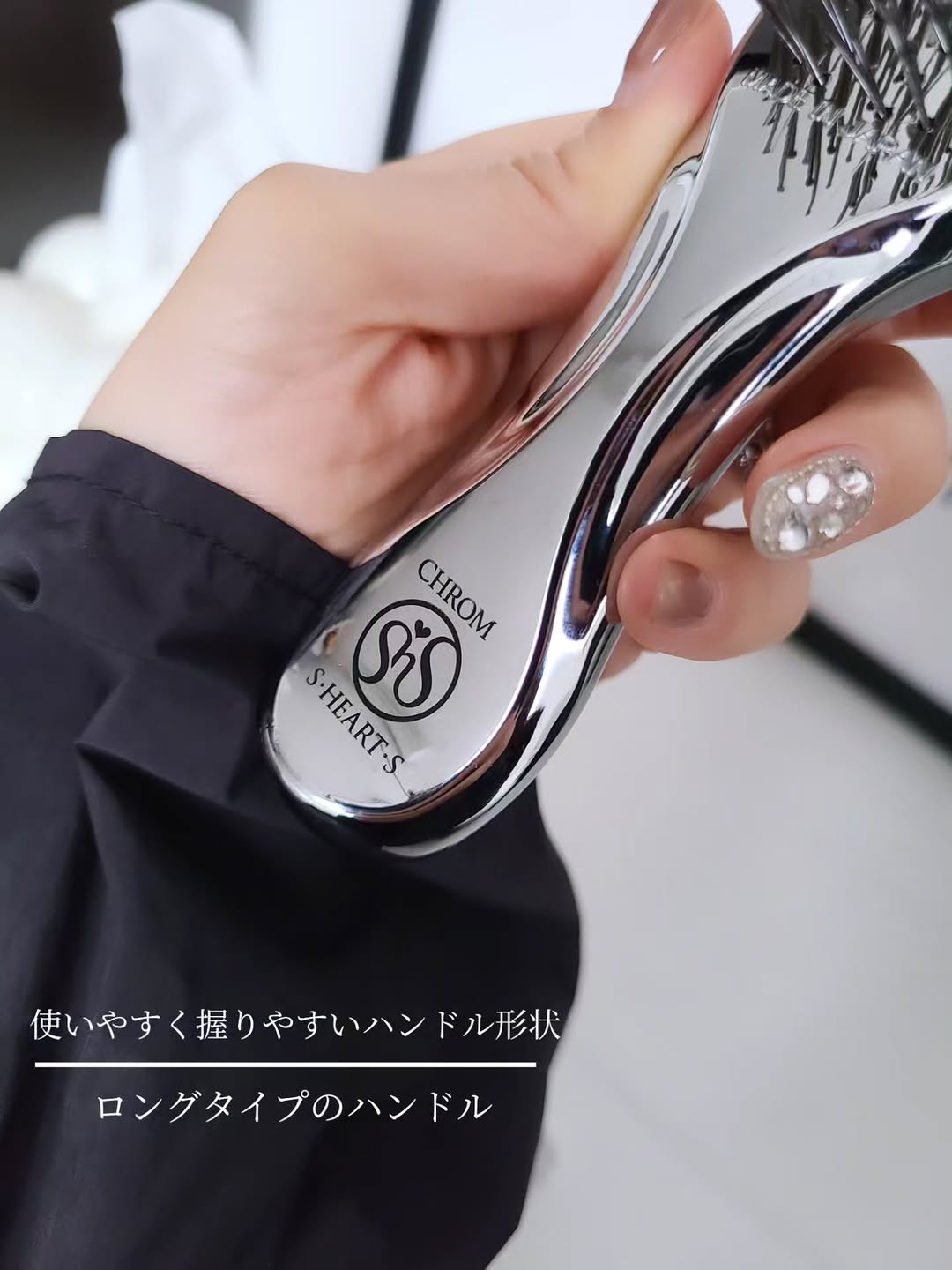 とかすだけでさらツヤすごい♡ お友達にも推している \最近のお気に入り美髪神ブラシ/ ●エスハートエス スカルプブラシ クロム ブラシ部分に静電気がとどまらない クロムメッキ加工と、 静電防止剤を練りこんだピン植毛により、 静電気防止に特化したスカルプブラシです ▷詳細は動画、picをみてね (ブラッシング毎のツヤ増しみてほしいっ!) ブラッシングだけでこんなに変わるの?! という程、見た目でわかるブラシでした🥺 シャンプー、トリートメント、頭皮マッサージ、スタイリング、ブロー等マルチに使えるよ 頭皮の毛穴に届く376本の先玉ピンでマッサージしながらのシャンプーは至福そのものだし スッキリ感も違う❤ トリートメント前後にブラシを使うと 手触り仕上がりが変わるので毎日使用してます クロムは濡れ髪でも絡まないのが嬉しい ドライ後太髪ロングヘアでも 毛先まで一気にブラッシング出来ちゃう 使用感が本気で素晴らしい♡ クロムメッキ加工の高級感とおしゃれなデザインなのでギフトにも喜ばれると思います🫶 @shearts.brush #PR #エスハートエス #シャンプーブラシ #スカルプブラシ #静電気防止ブラシ #クロム #monipla #shearts_fan #美髪 #艶髪 #頭皮マッサージブラシ #お気に入りブラシ #スカルプブラシクロム