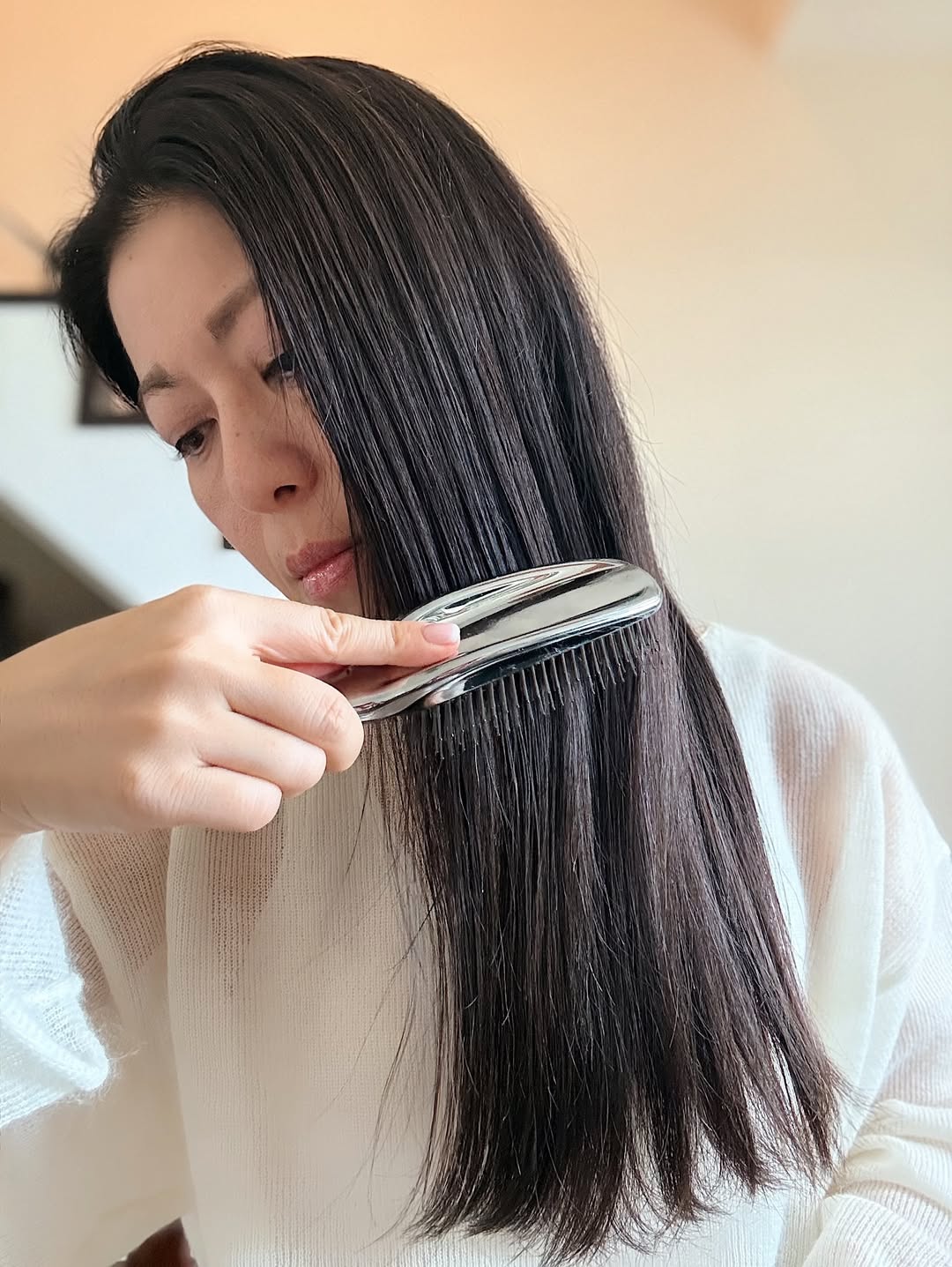 【 ヘアケアのお話 】 かれこれ5年程髪を伸ばしてロングにしています。 あと10cmくらいが目標なのですが、毛先のダメージが気になって切ってしまうので、なかなか伸びないんですよね。 やはり日々のホームケアが大切だわ、という事で ちょっと素敵なヘアブラシを試してみました。 *エスハートエス スカルプブラシ「クロム」* @shearts.brush クロムメッキ加工にボディと静電気防止剤剤を練り込んだピンで、髪の毛の痛みを防いでくれるそう。 細くて柔らかいピンが細かーく沢山植え込まれていて、地肌にピンが触れる時の新感覚にびっくり。 すっごく気持ちが良いです☺️ 乾いた髪はもちろん、シャンプーブラシとしても使える設計になっています。 毎日ブラッシングして、美髪目指します✨ #PR #エスハートエス #シャンプーブラシ #スカルプブラシ #ヘアケア #静電気防止ブラシ #クロム #ロングヘア #monipla #shearts_fan #haircare