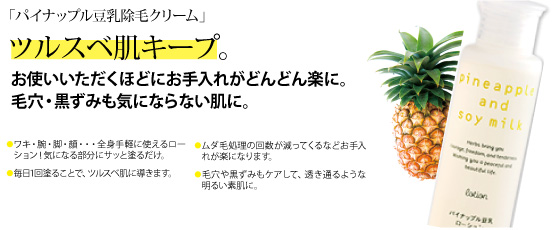 塗るだけ簡単ムダ毛ケア!で大人気の『パイナップル豆乳ローション』をはじめとしたスキンケア商品を販売中の鈴木ハーブ研究所が運営する、ファンサイトです。 皆さまのご参加お待ちしております。 |