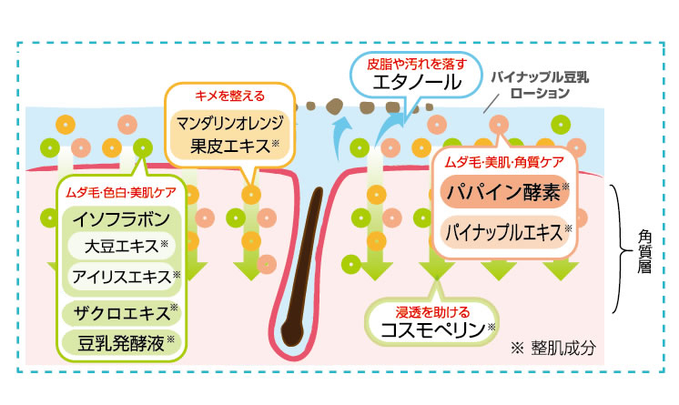 パイナップルエキスや大豆エキスなど、植物由来の成分が働きかけ、ムダ毛のお手入れを楽にします。
