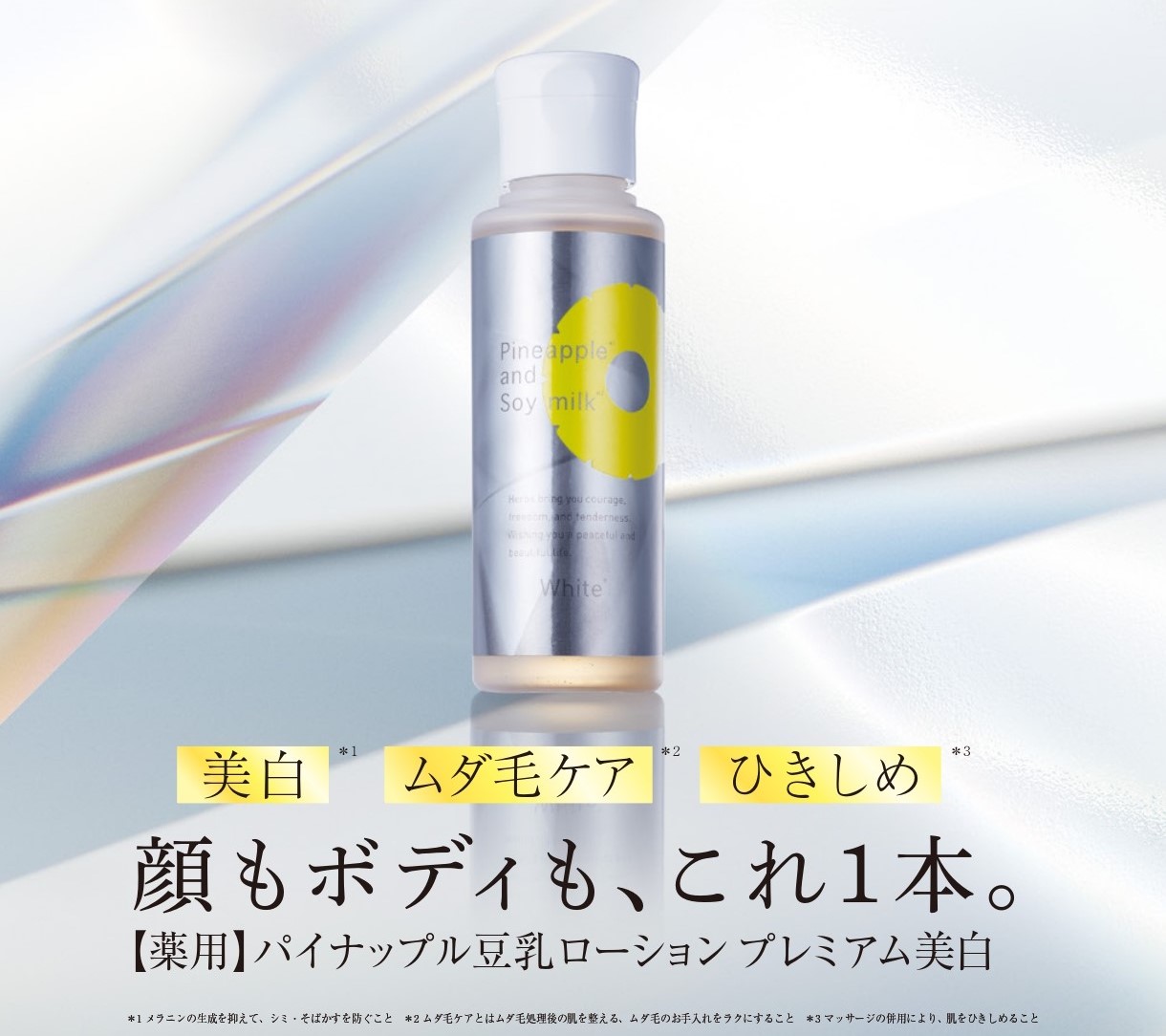 塗るだけのムダ毛ケアで大人気のパイナップル豆乳シリーズから新発売した「パイナップル豆乳ローションプレミアム美白」を5名様にプレゼント!