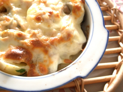 いつも我が家では炊飯器でお米を焚く時にジャガイモを一緒に入れて蒸しますそのジャガイモとツナと大葉を入れて、マヨネーズと黒コショウで味付けしてチーズを乗せてトースターで焼けば、ホックホクのグラタンが出来上がり 2012/11/02