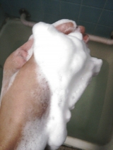 出来た泡を泡立てネットから絞り、優しく洗顔してください。