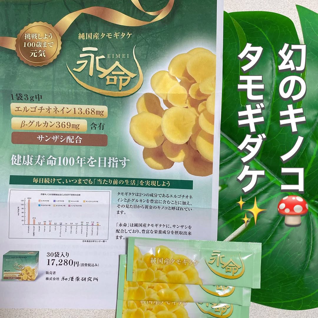 人生をこれからも健康に過ごしたいあなたへ タモギタケは2つの有効成分であるエルゴチオネインとβグルカンを豊富に含むことに加え、その見た目から黄金のキノコと呼ばれています。本製品は「純国産」のタモギタケに、サンザシを配合しており、豊富な栄養成分を摂取することができます。