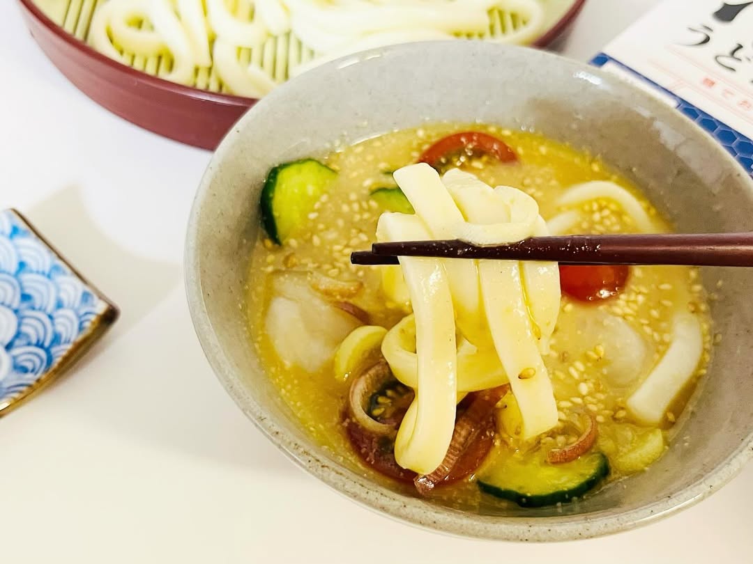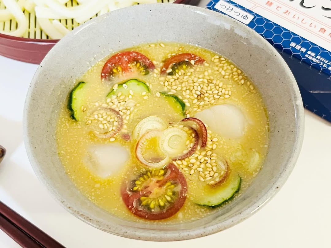 【正田醤油 <麺でおいしい食卓>冷汁うどんつゆ(春夏限定)】 暑い日にぴったり! 冷汁うどんは、埼玉を中心に暑い夏の農作業の合間などに、手軽に食べられる料理として伝承されてきた郷土料理。 味噌とゴマをベースにしたつけつゆに、きゅうりや大葉などの薬味をたっぷりと加えて冷たくしめたうどんをつけて食べるもの。 1人前の個包装が3袋入り。 米と麦の合わせ味噌をベースに練りごまとすりごまを合わせたまろやかでコクのあるつけつゆ。 大葉がアクセントになっていて、風味豊かな味わい。 今回、チャペスは、冷たくしたうどんに、具材は、きゅうり、みょうが、ミニトマトと生ほたて、そして、白ごまにしたよ。 甘めのつけつゆで相性バッチリでとても美味しかったよ。 具材は、たっぷり入れたほうが美味しくて好き。 @shoda_shoyu1873 #PR #正田醤油株式会社 #正田醤油 #麺でおいしい食卓 #麺でおいしい食卓冷汁うどんつゆ #麺でおいしい食卓シリーズ #冷汁うどんつゆ #冷汁うどん #冷汁 #ゴマ #胡麻 #ごま #麺 #うどん #うどんがおすすめ #麺料理 #つけつゆ #料理写真 #料理 #埼玉の味 #埼玉郷土の味 #薬味 #薬味たっぷりが美味しい #正田 #醤油 #シリーズ10周年 #おいしいがうれしい #おいしいがうれしい正田醤油 #monipla #shoda_fan