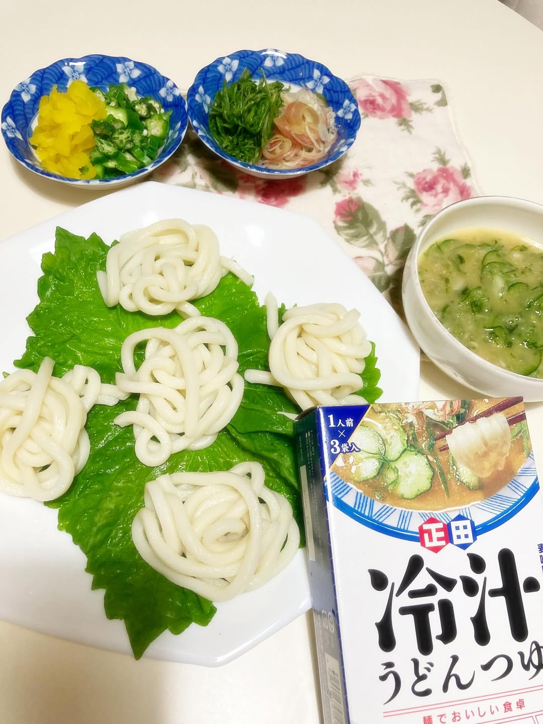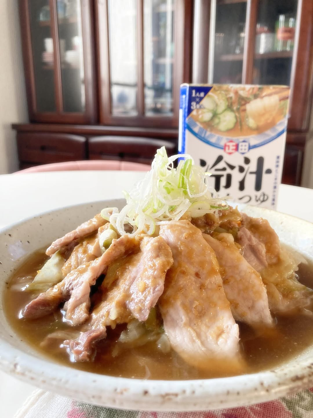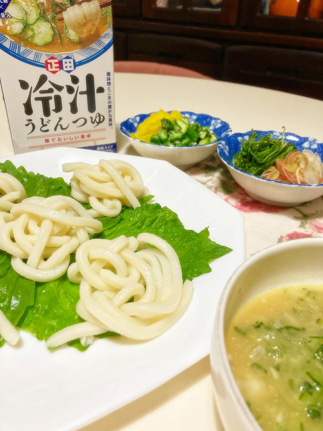 🕊𓂃 𓈒𓏸◌ ✼••┈┈••✼••┈┈••✼••┈┈••✼••┈┈••✼ <麺でおいしい食卓>冷汁うどんつゆ(春夏限定)をお試しさせて頂きました🤗💕 埼玉県の郷土料理の冷や汁は、「冷や汁」のことを「すったて」や「冷やし汁」「つったて」とも呼ばれ、 農作業の合間に手軽に食べられるメニューとして伝承されてきた郷土料理です。 野菜などの具材をすりばちで、「すりたて」を食べていたことに由来するそうです。 お日様をたくさん受けて成長した夏野菜と、冷たい水を使い仕上げる「冷や汁」は、夏の猛暑でほてった体を冷やしたいときにもおススメの郷土料理です。 タンパク質が豊富で塩分も補給できる、みそで味付けされた冷汁うどんつゆを使って冷汁を作ってみました。 🎈🎈🎈冷汁うどん🎈🎈🎈 材料(2人分) 冷汁うどんつゆ 大葉4~5枚 玉ねぎ1/4個 氷適量 キュウリ1/2本 ミョウガ 1個 だし汁(かつおだし)、または冷水50cc うどん250g 作り方 1 冷汁うどんつゆ、玉ねぎ(みじん切り)、大葉(みじん切り)を加えて、すり鉢でゴマとあわせる。 2 キュウリを輪切りにし、すり鉢に加え、すりこ木で軽くたたいたうえで、よく混ぜ合わせる。 3 だし汁又は冷水を加えてよく混ぜ合わせる。好みで濃度を調整する。 4 鉢に氷を入れて冷たい汁にする。 2つ目は我が家のてっぱん ワンパン料理 キャベツと豚バラのうま味を限界まで引き出した無水調理のウマ旨料理です! 🎈🎈🎈キャベツと豚バラのゴマダレ炒め🎈🎈🎈 【材料】 豚バラスライス 200g キャベツ 1/4玉 冷汁うどんつゆ 1袋 またはめんつゆ(2倍濃縮) 大さじ3 ごまだれ 大さじ2 焼き肉のタレ 大さじ2 ポン酢 大さじ2 おろしにんにく 2cm ※きざみねぎ 【作り方】 ①キャベツを食べやすい大きさにカット ②フライパンに①、豚バラスライスを敷き詰めたらうどんつゆを回しがけフタして中火で5分加熱 ※アルミホイルでフタしてもOK ③ゴマダレ、焼き肉のタレ、ポン酢、おろしにんにくを混ぜたら②に回しがけて完成 続いて、冷汁うどんつゆを使って、白和えを作り。 🎈🎈🎈てぬき白和え🎈🎈🎈 材料(2人分) 木綿豆腐 150g 乾燥わかめ 大さじ2 砂糖 大さじ1/2 すりごま 大さじ1と1/2 冷汁うどんつゆ またはめんつゆ(4倍濃縮) 大さじ1 作り方 1 全ての材料をボウルにいれ、豆腐が滑らかになるまでよく混ぜます。 2 15~20分、わかめが戻るまで放置して完成です。 めちゃ簡単で、食の進まない暑い日でもさっぱりと食べられる、おいC~レシピです。 ベースのうどんつゆの味が安定して美味しいから、どんなお料理にも使えるし、 時短にもなってめちゃ使いやすい♪ ほかにも正田醬油株式会社様から、うどんつゆが出ているので、気になった方は コチラをチェックしてね😚💞 https://www.shoda.co.jp/product/katei/1718 ちなみに、第一弾冷汁うどんつゆの投稿はこちらです⤵️ https://www.instagram.com/p/DIIyQnFS4Y9/?hl=ja&img_index=1 *:..。o○★○o。..:*゚*:..。o○★○o。 <麺でおいしい食卓>冷汁うどんつゆ 容量:150g(50g×3袋) 希望小売価格330円(税抜) 賞味期間300日 *:..。o○★○o。..:*゚*:..。o○★○o。 #PR #正田醤油株式会社 #正田醤油 #麺でおいしい食卓 #麺でおいしい食卓冷汁うどんつゆ #麺でおいしい食卓シリーズ #冷汁うどんつゆ #冷汁うどん #冷汁 #ゴマ #胡麻 #ごま #麺 #うどん #うどんがおすすめ #麺料理 #つけつゆ #料理写真 #料理 #埼玉の味 #埼玉郷土の味 #薬味 #薬味たっぷりが美味しい #正田 #醤油 #シリーズ10周年 #おいしいがうれしい #おいしいがうれしい正田醤油 #monipla #shoda_fan