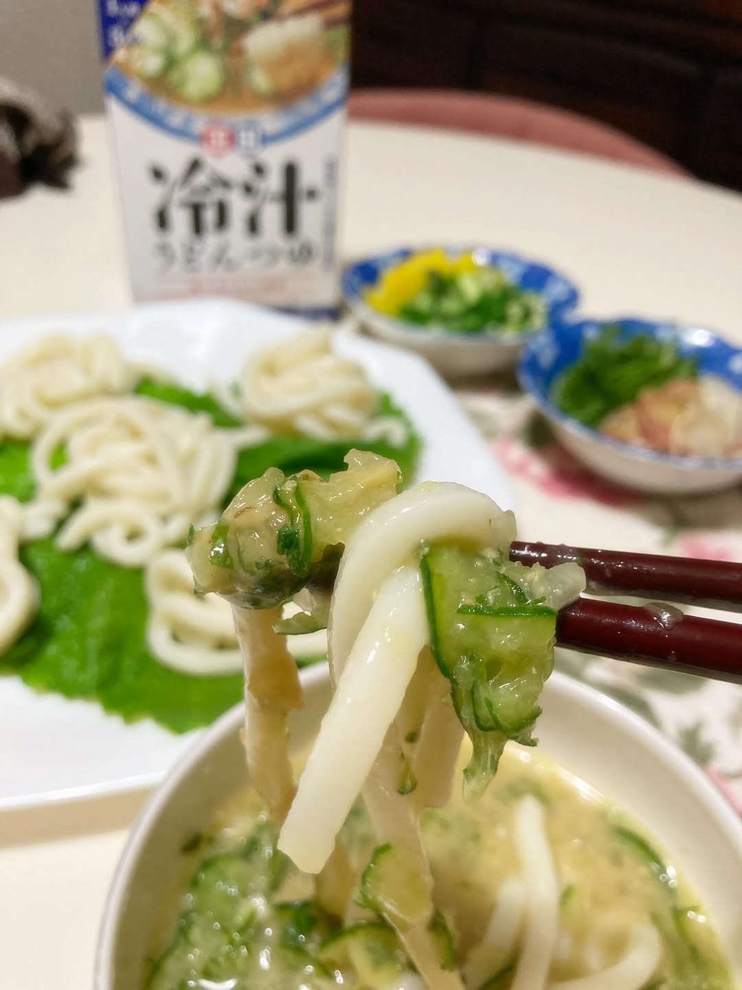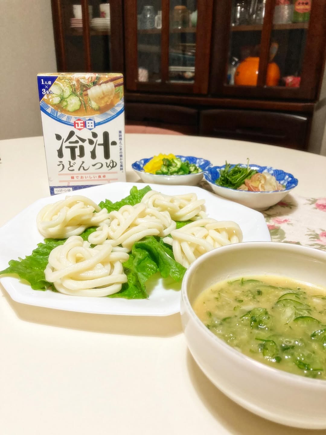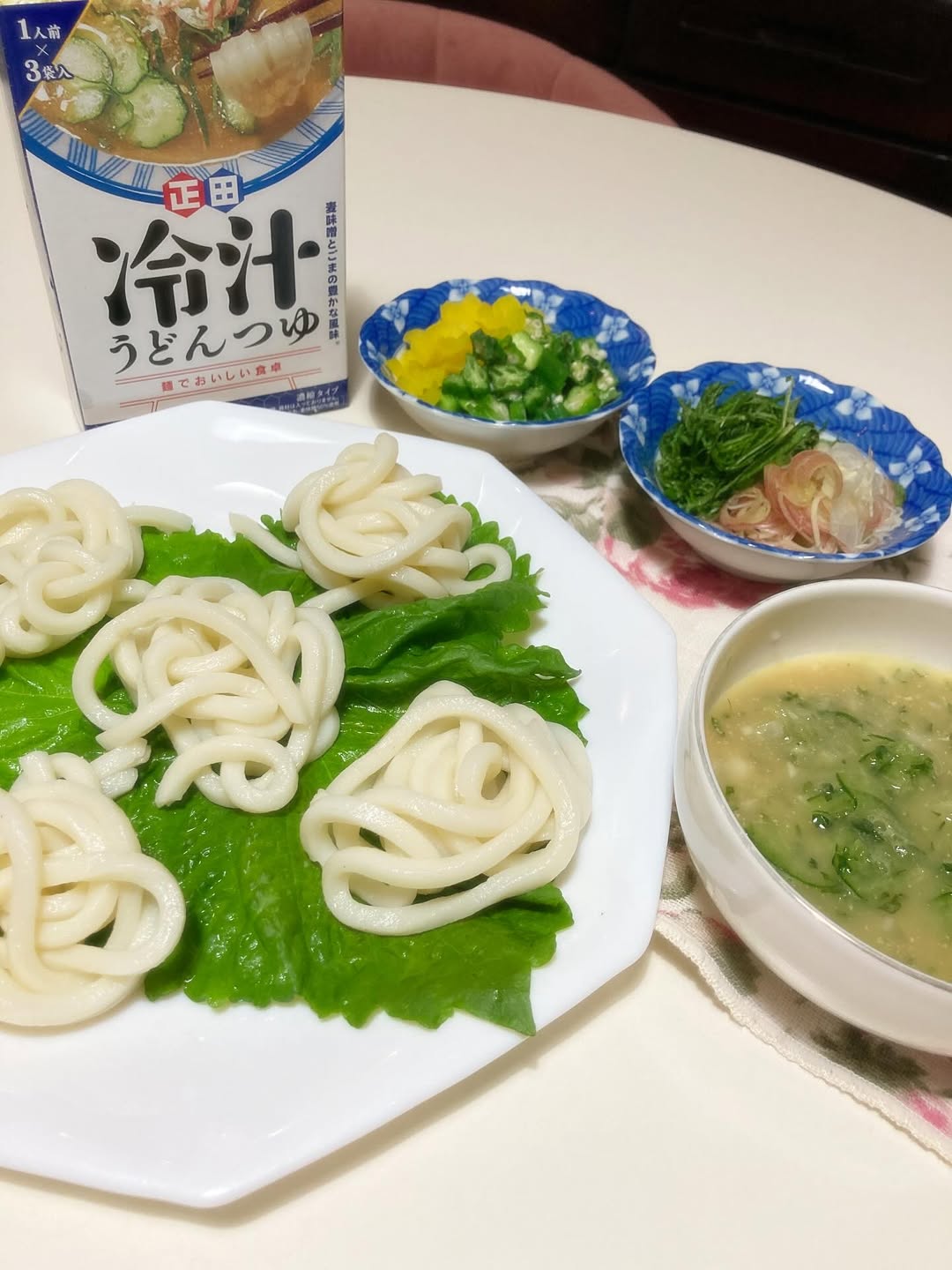 🕊𓂃 𓈒𓏸◌ ✼••┈┈••✼••┈┈••✼••┈┈••✼••┈┈••✼ <麺でおいしい食卓>冷汁うどんつゆ(春夏限定)をお試しさせて頂きました🤗💕 埼玉県の郷土料理の冷や汁は、「冷や汁」のことを「すったて」や「冷やし汁」「つったて」とも呼ばれ、 農作業の合間に手軽に食べられるメニューとして伝承されてきた郷土料理です。 野菜などの具材をすりばちで、「すりたて」を食べていたことに由来するそうです。 お日様をたくさん受けて成長した夏野菜と、冷たい水を使い仕上げる「冷や汁」は、夏の猛暑でほてった体を冷やしたいときにもおススメの郷土料理です。 タンパク質が豊富で塩分も補給できる、みそで味付けされた冷汁うどんつゆを使って冷汁を作ってみました。 🎈🎈🎈冷汁うどん🎈🎈🎈 材料(2人分) 冷汁うどんつゆ 大葉4~5枚 玉ねぎ1/4個 氷適量 キュウリ1/2本 ミョウガ 1個 だし汁(かつおだし)、または冷水50cc うどん250g 作り方 1 冷汁うどんつゆ、玉ねぎ(みじん切り)、大葉(みじん切り)を加えて、すり鉢でゴマとあわせる。 2 キュウリを輪切りにし、すり鉢に加え、すりこ木で軽くたたいたうえで、よく混ぜ合わせる。 3 だし汁又は冷水を加えてよく混ぜ合わせる。好みで濃度を調整する。 4 鉢に氷を入れて冷たい汁にする。 2つ目は我が家のてっぱん ワンパン料理 キャベツと豚バラのうま味を限界まで引き出した無水調理のウマ旨料理です! 🎈🎈🎈キャベツと豚バラのゴマダレ炒め🎈🎈🎈 【材料】 豚バラスライス 200g キャベツ 1/4玉 冷汁うどんつゆ 1袋 またはめんつゆ(2倍濃縮) 大さじ3 ごまだれ 大さじ2 焼き肉のタレ 大さじ2 ポン酢 大さじ2 おろしにんにく 2cm ※きざみねぎ 【作り方】 ①キャベツを食べやすい大きさにカット ②フライパンに①、豚バラスライスを敷き詰めたらうどんつゆを回しがけフタして中火で5分加熱 ※アルミホイルでフタしてもOK ③ゴマダレ、焼き肉のタレ、ポン酢、おろしにんにくを混ぜたら②に回しがけて完成 続いて、冷汁うどんつゆを使って、白和えを作り。 🎈🎈🎈てぬき白和え🎈🎈🎈 材料(2人分) 木綿豆腐 150g 乾燥わかめ 大さじ2 砂糖 大さじ1/2 すりごま 大さじ1と1/2 冷汁うどんつゆ またはめんつゆ(4倍濃縮) 大さじ1 作り方 1 全ての材料をボウルにいれ、豆腐が滑らかになるまでよく混ぜます。 2 15~20分、わかめが戻るまで放置して完成です。 めちゃ簡単で、食の進まない暑い日でもさっぱりと食べられる、おいC~レシピです。 ベースのうどんつゆの味が安定して美味しいから、どんなお料理にも使えるし、 時短にもなってめちゃ使いやすい♪ ほかにも正田醬油株式会社様から、うどんつゆが出ているので、気になった方は コチラをチェックしてね😚💞 https://www.shoda.co.jp/product/katei/1718 ちなみに、第一弾冷汁うどんつゆの投稿はこちらです⤵️ https://www.instagram.com/p/DIIyQnFS4Y9/?hl=ja&img_index=1 *:..。o○★○o。..:*゚*:..。o○★○o。 <麺でおいしい食卓>冷汁うどんつゆ 容量:150g(50g×3袋) 希望小売価格330円(税抜) 賞味期間300日 *:..。o○★○o。..:*゚*:..。o○★○o。 #PR #正田醤油株式会社 #正田醤油 #麺でおいしい食卓 #麺でおいしい食卓冷汁うどんつゆ #麺でおいしい食卓シリーズ #冷汁うどんつゆ #冷汁うどん #冷汁 #ゴマ #胡麻 #ごま #麺 #うどん #うどんがおすすめ #麺料理 #つけつゆ #料理写真 #料理 #埼玉の味 #埼玉郷土の味 #薬味 #薬味たっぷりが美味しい #正田 #醤油 #シリーズ10周年 #おいしいがうれしい #おいしいがうれしい正田醤油 #monipla #shoda_fan