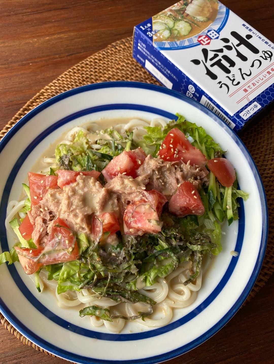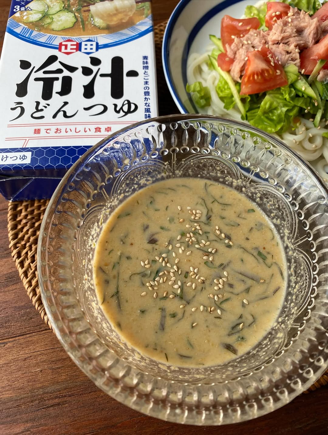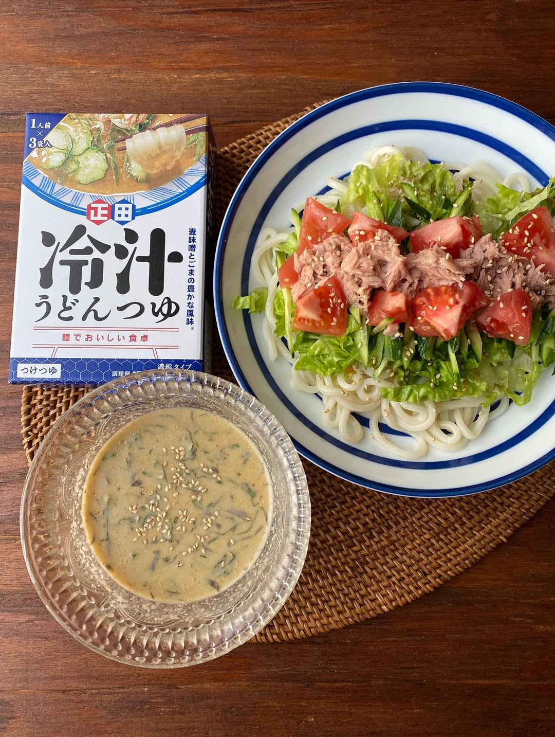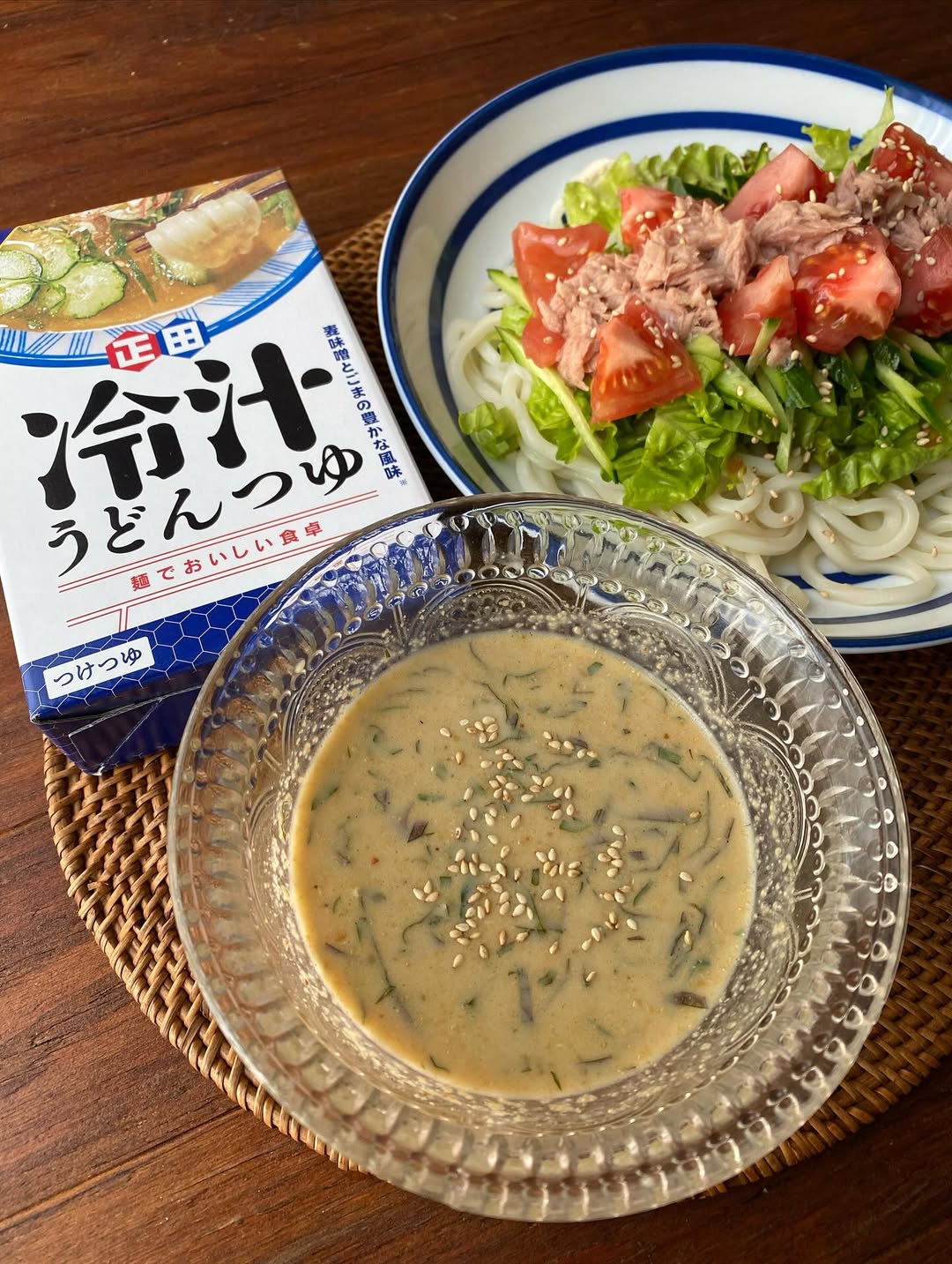 今日のごはん @shoda_shoyu1873 さまの 麦味噌とごまの風味が美味しい 《冷汁うどんつゆ》 を使って ミルキーサラダうどん🥗 冷汁うどんつゆ 1袋に 牛乳を50ml加えて 大葉の千切りを加えます 茹でて冷やしたうどんに 好きな野菜をのせて うどんのつゆをかけるだけ♪ まろやかなつゆが クリーミーになって さらに美味😋 レタスときゅうり、トマトとツナを のせていますが しゃぶしゃぶのお肉をのせても 美味しそうな予感。 これから暑くなるので 食欲もなくなりがちですが 冷たいうどんだと つるつる食べ進められるから 夏バテ予防にもなりそうです☀️ #PR #正田醤油株式会社 #正田醤油 #麺でおいしい食卓 #麺でおいしい食卓冷汁うどんつゆ #麺でおいしい食卓シリーズ #冷汁うどんつゆ #冷汁うどん #冷汁 #ゴマ #胡麻 #ごま #麺 #うどん #うどんがおすすめ #麺料理 #つけつゆ #料理写真 #料理 #埼玉の味 #埼玉郷土の味 #薬味 #薬味たっぷりが美味しい #正田 #醤油 #シリーズ10周年 #おいしいがうれしい #おいしいがうれしい正田醤油 #monipla #shoda_fan
