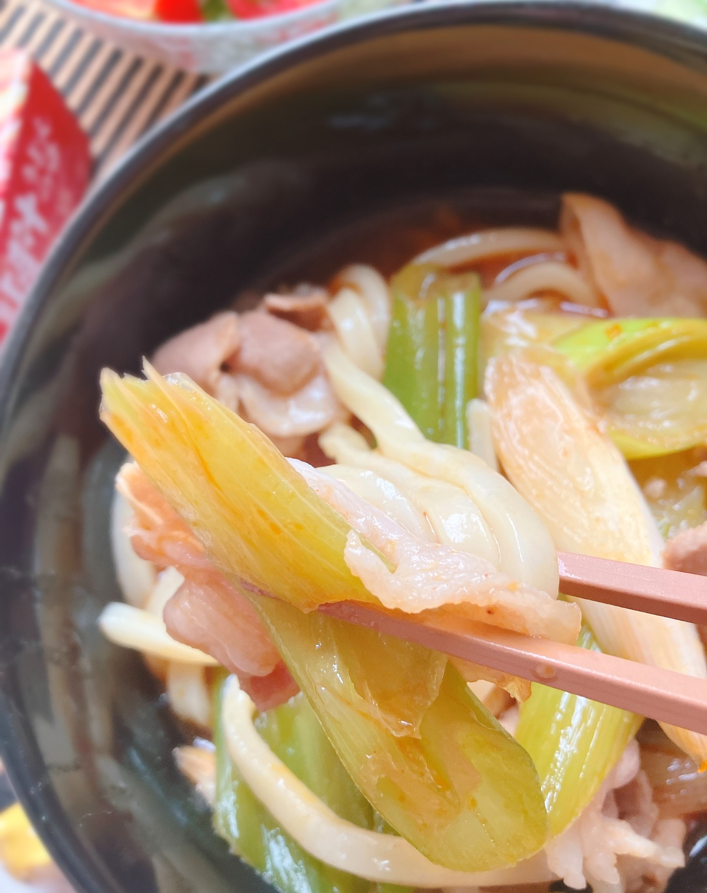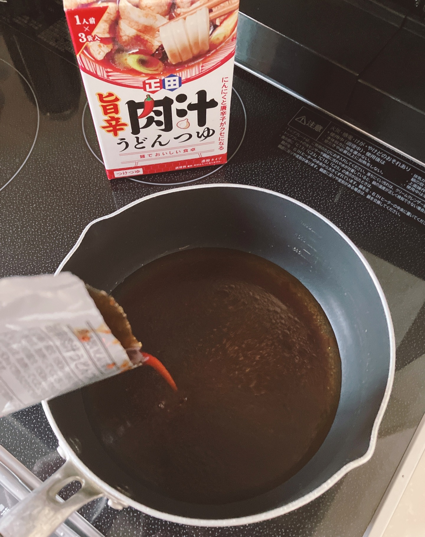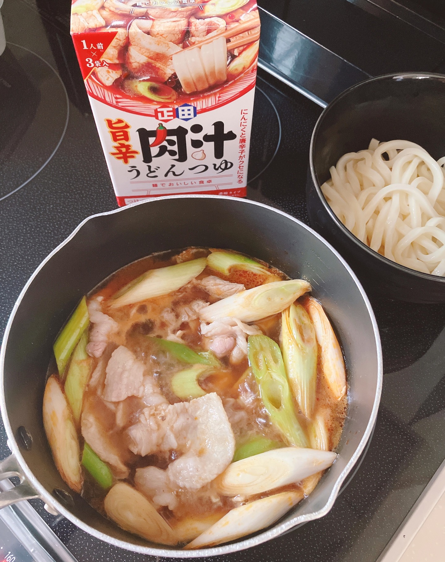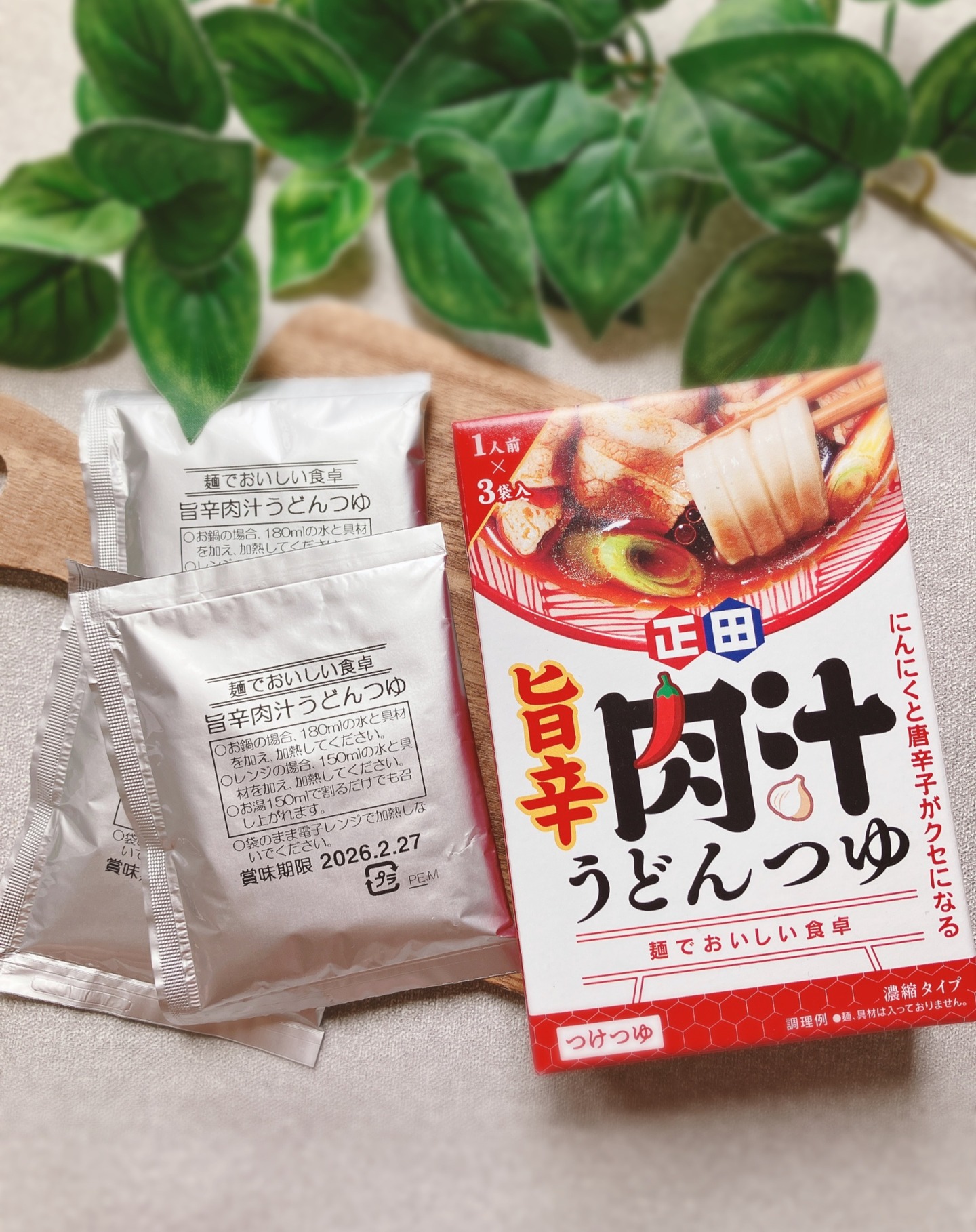 今日は、唐辛子とにんにくの程よいパンチがとっても美味しい!正田醤油様の”旨辛肉汁うどんつゆ”を使って一品!🔥