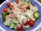 まろやかな豆乳とコクのあるごま、隠し味に香ばしいきなこでヘルシーに仕上げたごまドレッシングです。