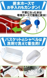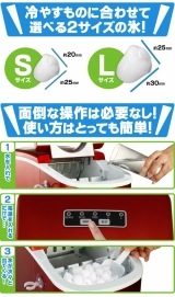 「あっ!氷がないっ!」そんな時に新型高速製氷機 家飲み、夕飯、突然の来客、レジャー・アウトドアなど氷が必要な時にできていなかったりしたことはありませんか? せっかく冷たいジュースやお茶、お水が飲めると思ったのに・・・なんてことがなくなるのが新型高速製氷機!もう、コンビニへダッシュして買いに行ったり、これから作らなきゃ・・・と悩む必要はありません。 水道水を入れてボタンを押すだけ!約30分で4人分の氷ができあがり! 氷の作り方はとっても簡単!フタを開けて水道水を入れ、フタを閉めてボタンを押すだけ! 後は最短約6分台~12分(※)で氷が出てくるスピード製氷!さらに待っていればゴロンゴロン氷ができてきます。 氷はSサイズ(直径約20mm)とLサイズ(直径約25mm)の2サイズを用途に合わせて選べます! 水切れ・氷満タンサインで自動停止してお知らせ! 本体内のタンクには約2.2リットルまで貯水、氷は約700gの一時保管が可能で、もしも水が切れた時や氷が満タンになった時にはランプがお知らせして動作が一時停止するので、余計な水を使わず氷で溢れてしまうことがありません。 氷がどれだけできたか分かりやすい窓や専用ホースでお手入れも簡単! 本体の上面には大きな窓がついていますので、今どれだけ氷ができているか一目で分かります。 氷にしなかったタンク内の水は専用の排水ホースで簡単に排水することができます。 ※時間はメーカーで計測した最初の製氷までの目安になり、使用環境や水温により異なります。 |