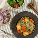 お料理教室で習った肉じゃがを作ってみました。 今まで作っていた肉じゃがレシピも美味しかったけど、先生のレシピにはみりんが入っているから照りが出て見栄えも断然美味しそう! もちろん味も抜群に美味しい。 定番メニューに決まり! 選りすぐりの国産天然素材を使っている、料亭御用達の化学調味料無添加和風だしを使いました。 手作りドレッシングをかけたサラダに🥗 もち麦ごはん🍚 2019/12/01