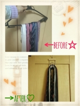 ネクタイの収納方法はさまざま専用ハンガーを使う場合でも、輪っかに通して掛けるタイプ、1本1本掛けるタイプと形はいろいろウチのネクタイ収納は、こんな感じはじめはネクタイだけだったのに、マフラー、ベルトと増えていって傾いてるし、、、ネクタイもすごく掛けずらいし取る時は他のもズレて落ちちゃう… 2015/10/30