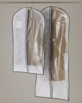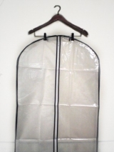 厚手の洋服の収納に最適なマチ付きタイプのカバーです。前面半分が透明なので、中の洋服が一目瞭然。残りの素材は通気性の良い不織布です。6cmのマチは肩部分ではしっかりと幅を保ちながら、裾部分ではすっきりと縫い合わせた仕様なので見た目がもたつきません。下からのホコリはもちろんシャットアウト。長期保管にも日常使いにもおすすめです。Sサイズはスーツやジャケット用、Lサイズはコートやワンピース用です。冬物をクリーニングに出された後にぜひお使いになって欲しいアイテムです。