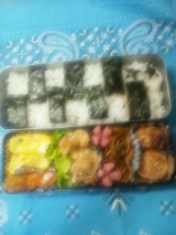 5月1日のお弁当 3目出汁たまご(干し椎茸大葉かまぼこ) エビフライ から揚げ ウインナー 焼きそば(冷食) たこ焼き(冷食) ご飯海苔弁 補食メロンパン 写真ボケてしまった 昨日はたくさん頂きものをしました 地元ホテルのケーキ Mちゃんからムスコ君のお下がり… 2013/05/01