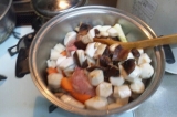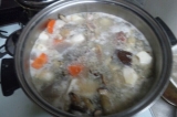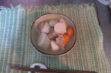 里芋、こんにゃく、鶏肉、人参、ごぼう、はす、干し椎茸あるから、『のっぺい』作ります 初めに鶏肉を炒めて、みんな入れて、表面に油が回ったら、干し椎茸の戻し汁と水入れますが…今日は、先ほど取りましたしまもとの本格素材だし『だしの優しさ』があるからそれを入れます あくがでてくるので… 2012/01/10