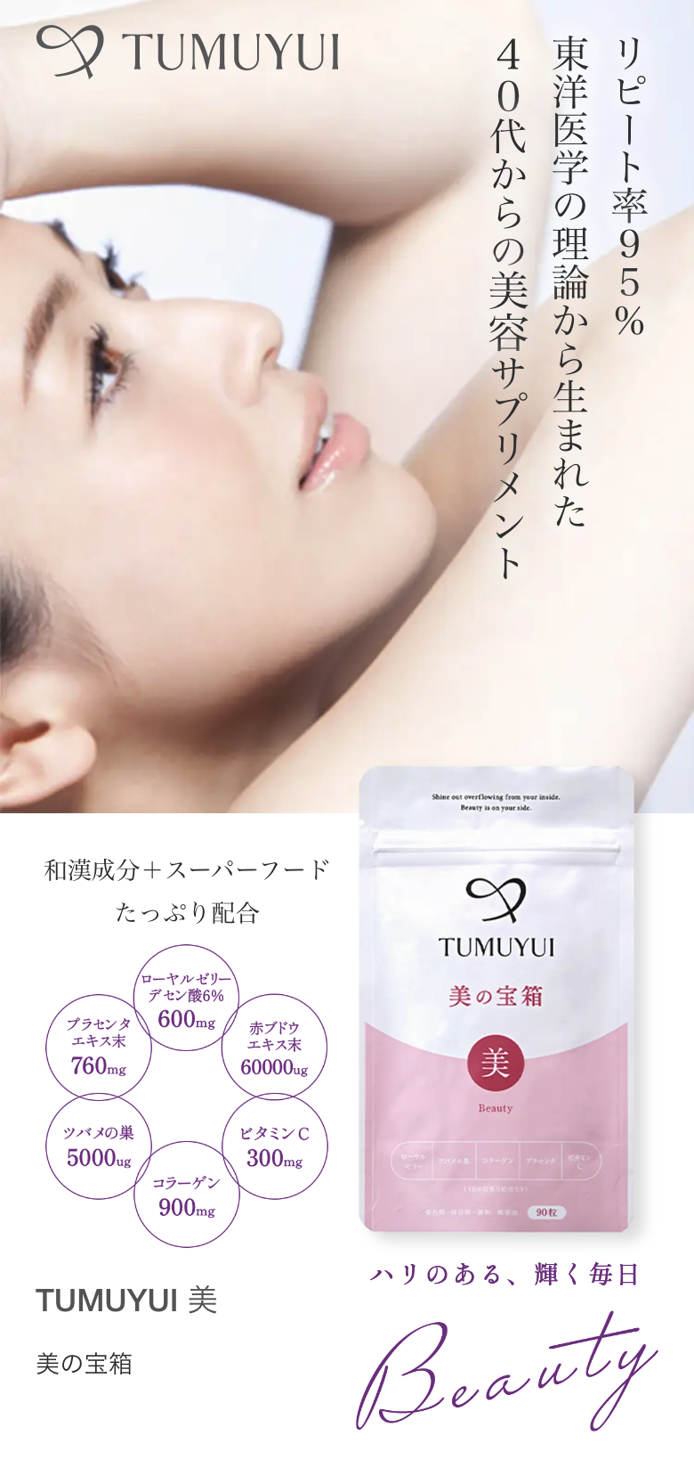 TUMUYUI 美の宝箱 健やかさと美しさを重ねながら、ハリのある、艶やかな日々へ。 「美の宝箱」には、9種の必須アミノ酸と15種のアミノ酸の他、 ビタミンやミネラルも豊富に含むローヤルゼリー(デセン酸6%配合)をはじめ、プラセンタ、ツバメの巣、コラーゲンなど、 いきいきと艶やかな大人の女性美をつくる天然成分を今までにないほど贅沢に詰め込んだ、まさに宝箱。 身体の芯から、美しさを重ねていけるのが良いね🌿 カプセルで飲みやすいから毎日続けやすいし綺麗になれる為に摂取! 小さいから持ち運びにも便利だし好きな時に飲めるのが良いな⭕️ #PR #シックスセンスラボ #美の宝箱 #TUMUYUI #monipla #sixthsenselab_fan 2023/12/29