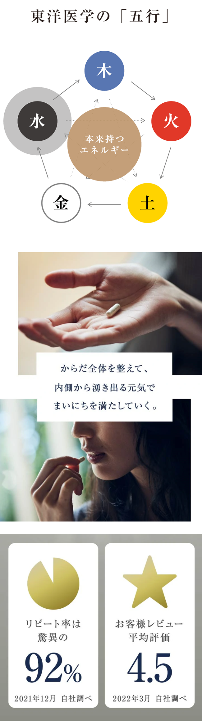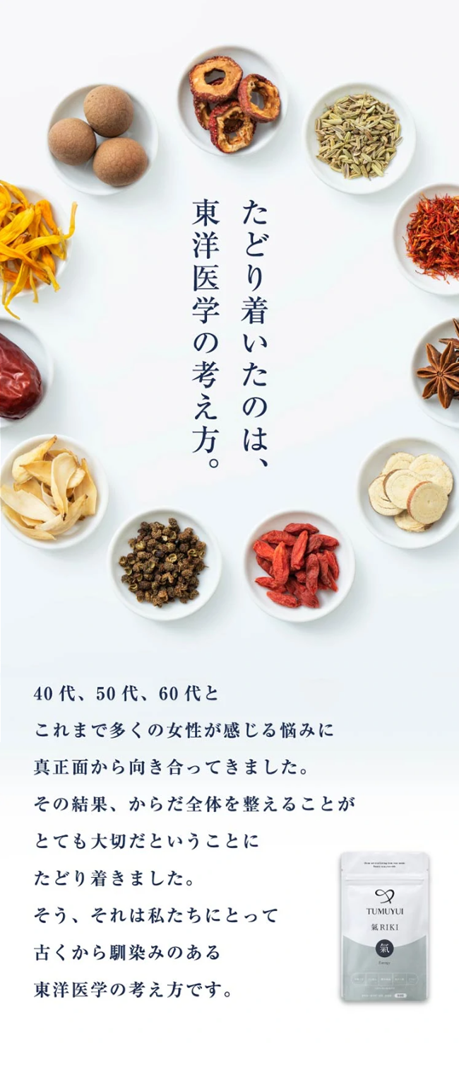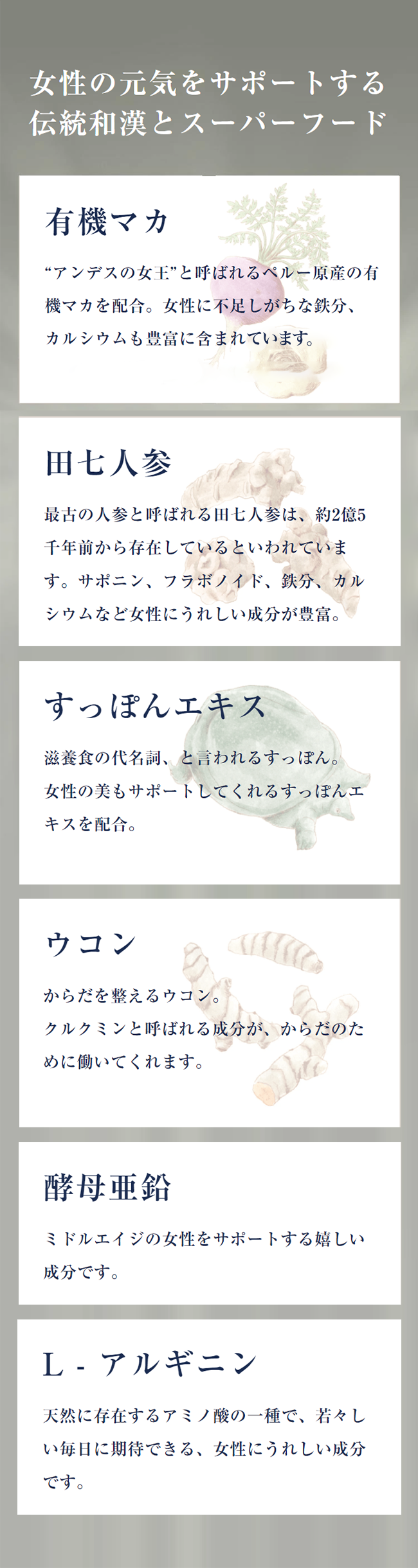 朝すっきりと目覚め、一日中、アクティブに、エネルギッシュに過ごしたい。「氣RIKI」には、“アンデスの女王”と呼ばれるペルー原産の有機マカをはじめ、女性の美もサポートしてくれるすっぽんエキスやエネルギーの素と言われる酵母亜鉛、田七人参など、大人の女性がより元気にいきいきと毎日を過ごすための天然成分を、惜しみなく、たっぷりと配合しています。