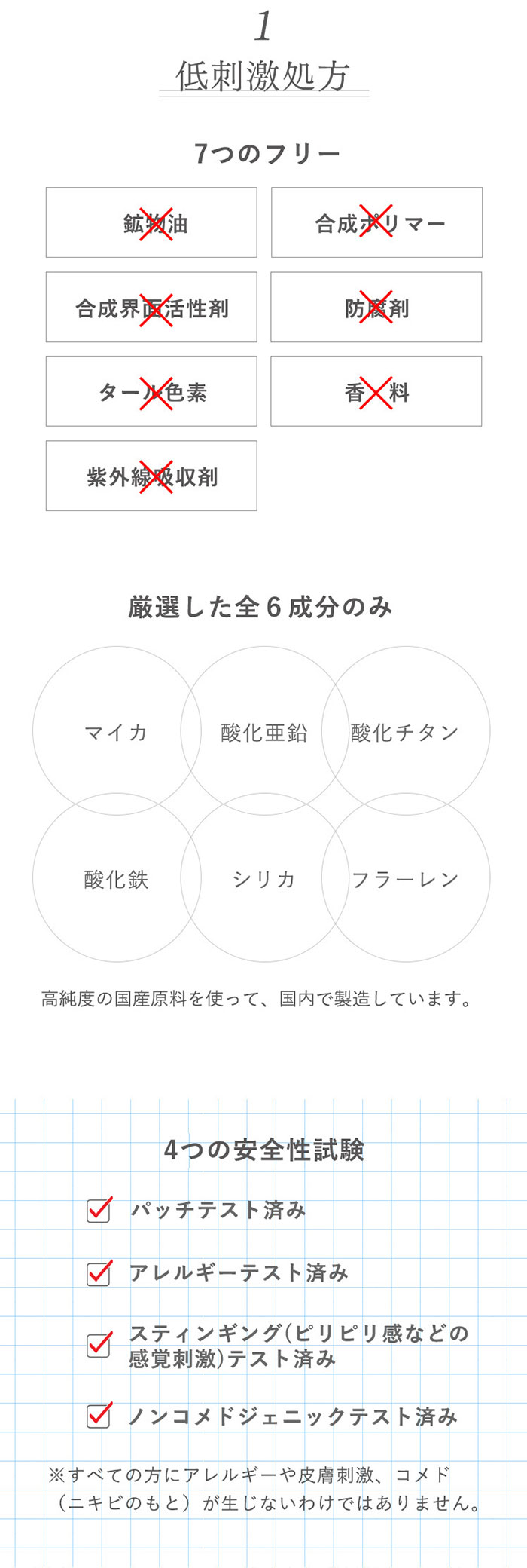 脱ファンデは目指したいけれど、石鹸で落とせるコスメなら罪悪感がない🥺紫外線吸収剤やナノ粒子不使用・SPF50+PA++++で肌にこんなに優しいのに日焼け対策もばっちり!整肌成分も配合されていて、以下の安全性試験済とのことで安心(´・ω・`)💓