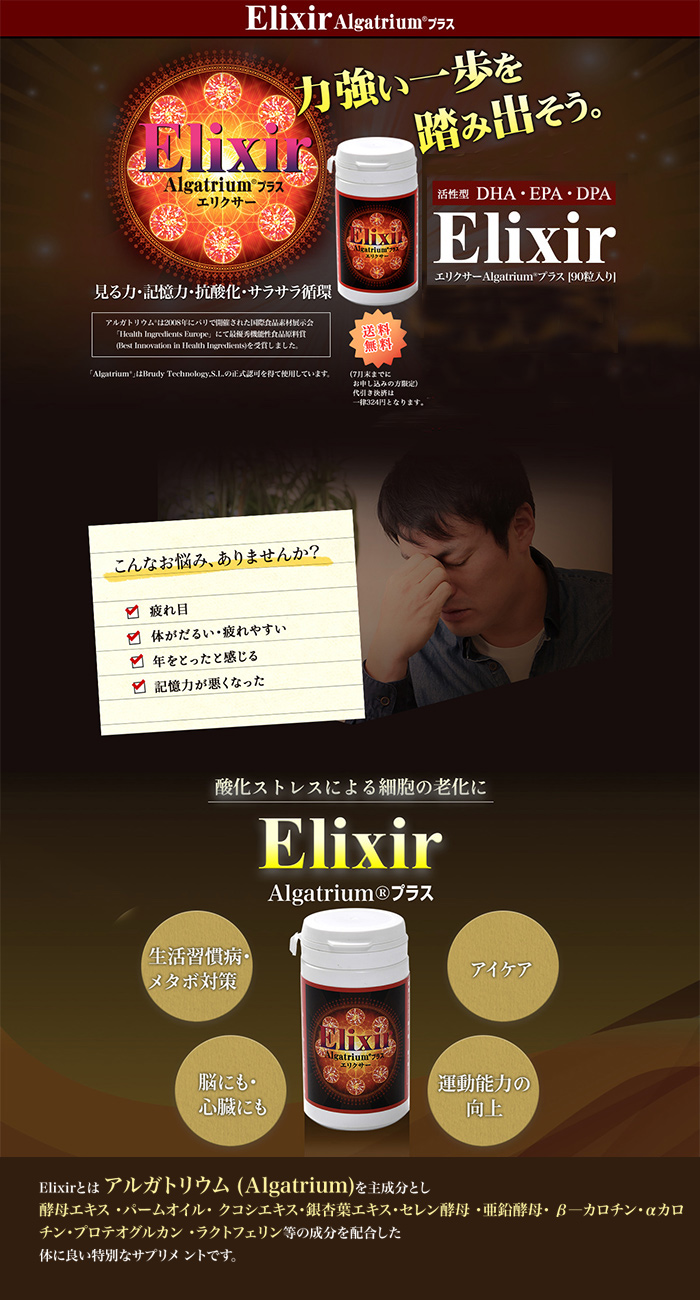 Elixirにはアルガトリウムの他にアルガトリウムが効率よく働く為の成分が配合されております。アルガトリウムはDHAでありながら体内で活性酸素を中和する抗酸化酵素を増やします。また体内グルタチオン濃度を3倍に増やし免疫力、解毒作用を上げることのできるスペインで世界特許出願中の活性型DHAです。 ▼商品詳細はコチラ http://elixir.skyheart.co.jp/
