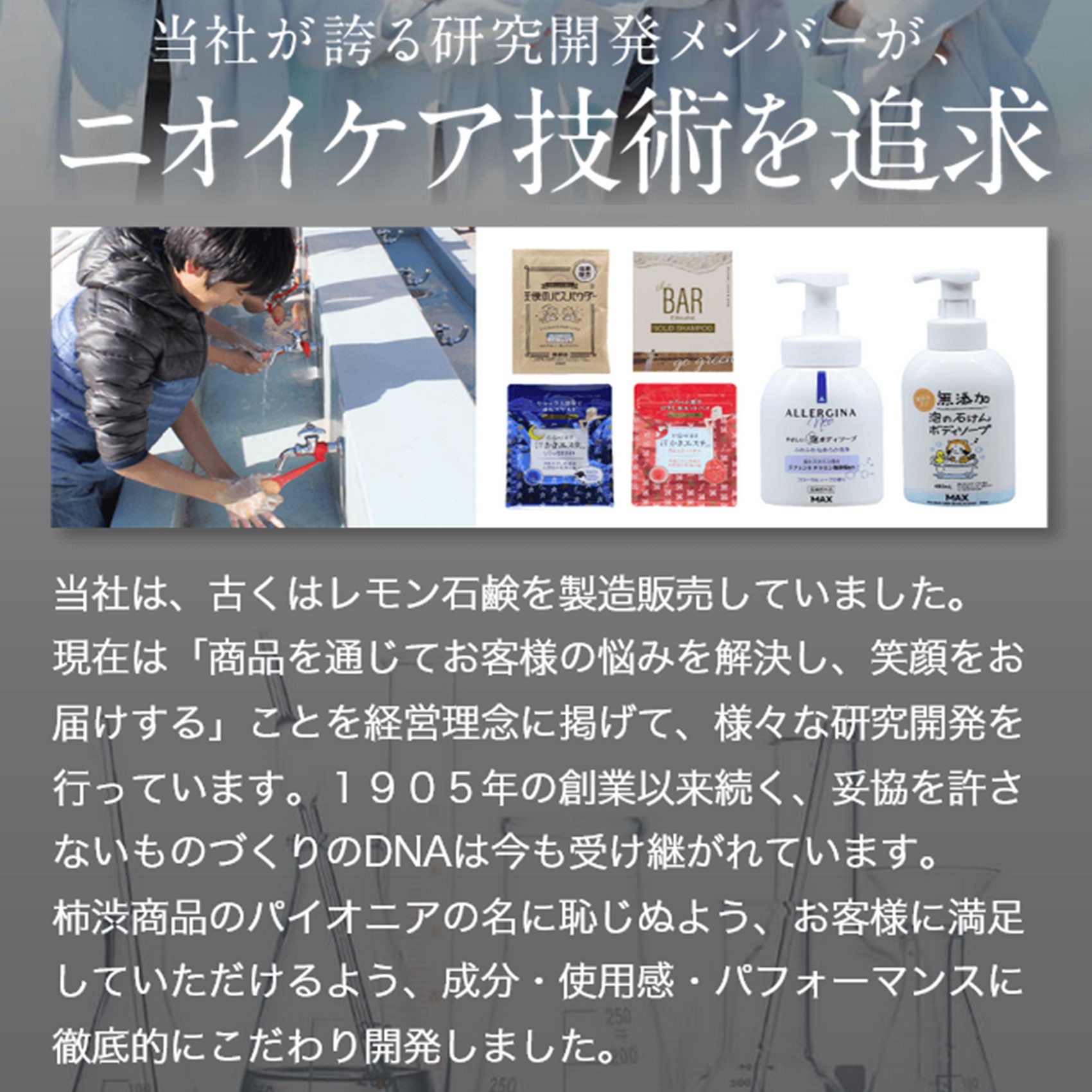 株式会社マックスは、古くは小学校の手洗い場でお馴染みのレモン石鹸など、固形石鹸のメーカーとして明治38年に創業した老舗メーカーです。その後、液体洗浄剤・入浴剤・化粧水など、ボディケア、フェイスケアそしてヘアケア商品へとラインナップを拡充して参りました。また取り扱う商品は、製造から出荷まで一貫して日本国内で行っています*。私共が目指すのは「独自の価値」を生み出す総合化粧品メーカーです。インターネットショップ以外にも、ドラッグストアやホームセンターなど一般店頭へも多くの商品を展開しています。
