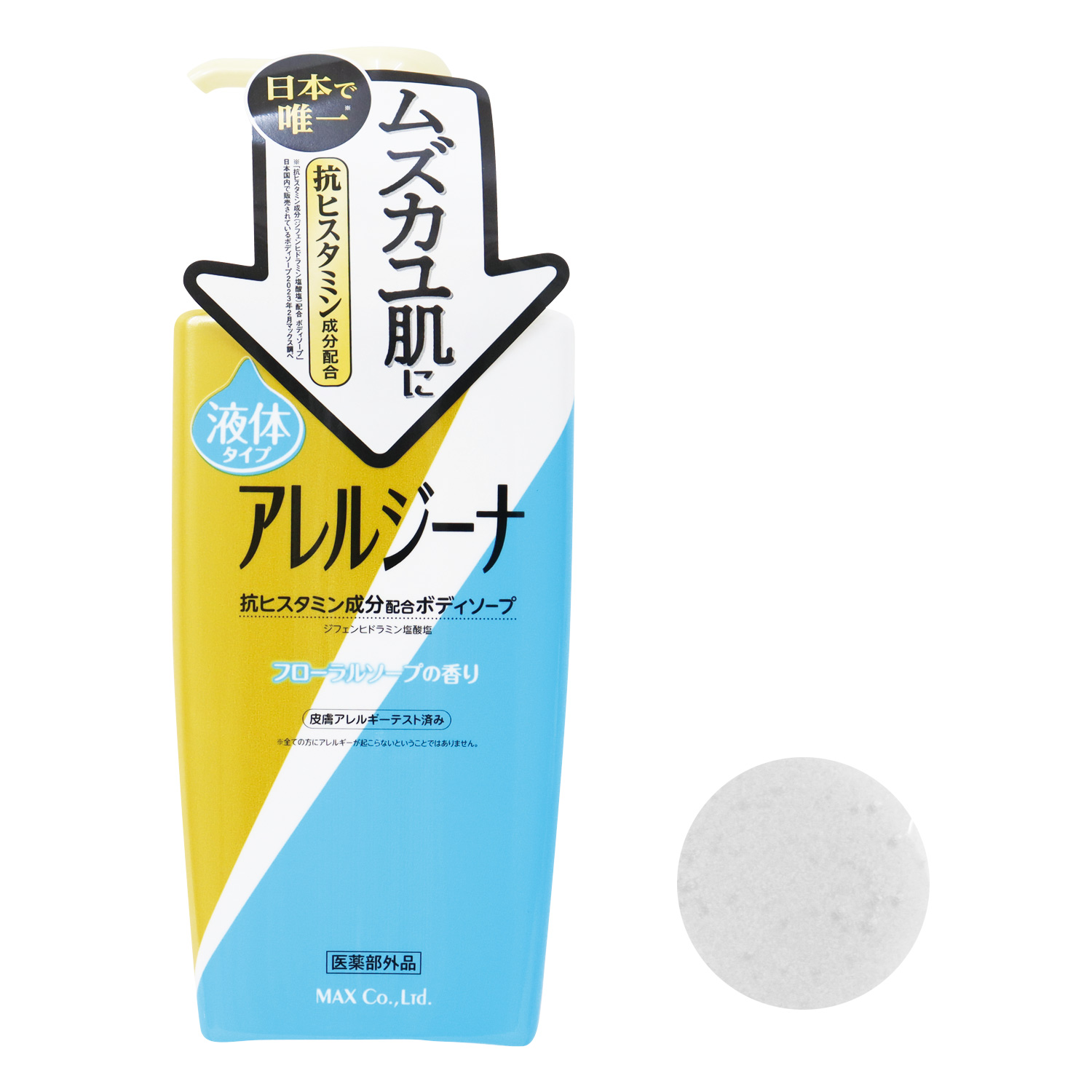 ※Instagramに投稿する際には #日本で唯一 #抗ヒスタミン #抗ヒスタミン成分配合 #抗ヒスタミン成分配合ボディソープ #アレルジーナ #家族で使える #ボディソープ #薬用ボディソープ #ムズカユ肌に #ジフェンヒドラミン塩酸塩 #ボディケア #モコモコ泡 #マックス石鹸 #マックスコスメ #マックスコスメオンラインショップ #monipla #soapmax_fan のハッシュタグをつけて投稿してください!