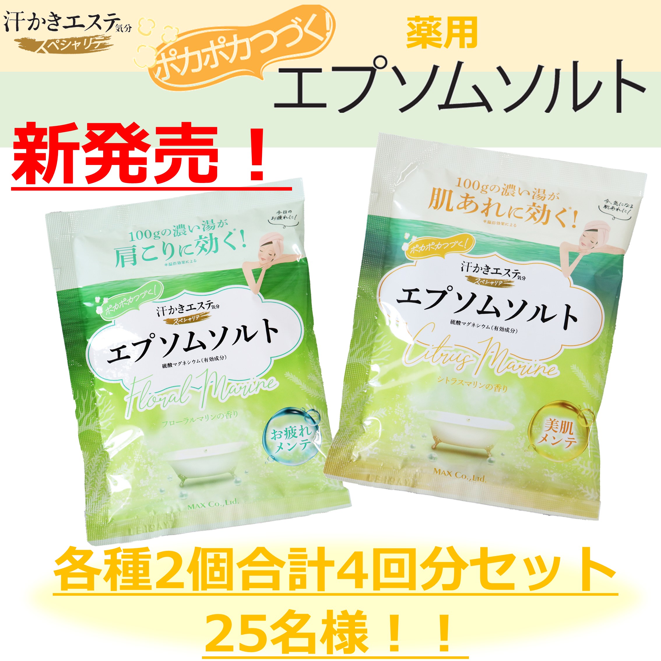 今回は、「汗かきエステ気分 スペシャリテ エプソムソルト 分包100g」を各種2個合計4個セットで25名様にプレゼント致します♪