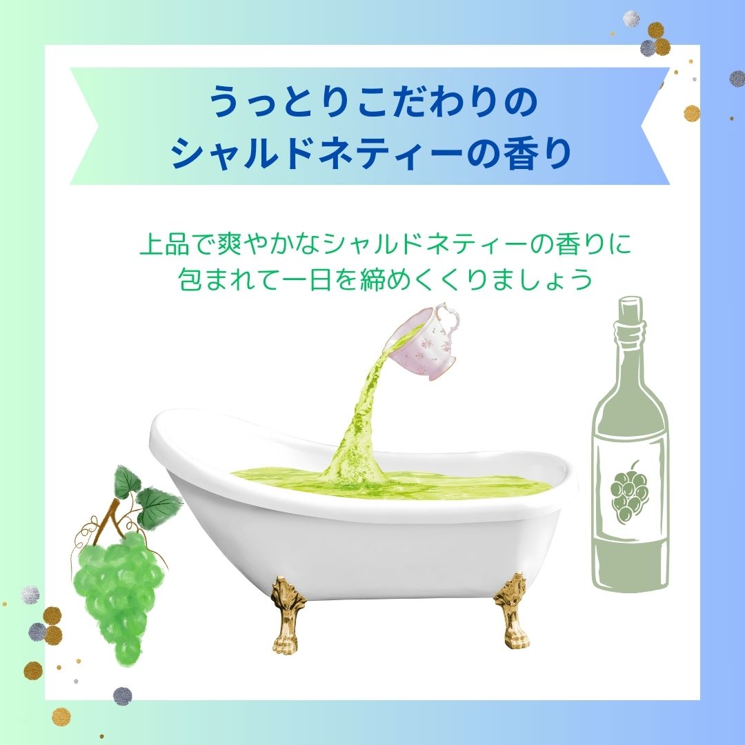 【うっとりこだわりのシャルドネティーの香り】 上品で爽やかなシャルドネティーの香りに包まれて、 一日を締めくくりましょう。お肌に嬉しい美肌 モイスチャー成分配合で、心身ともにリラックス ちょっぴり贅沢気分なバスタイムをお過ごしください。 レビュー数 : 46 |
