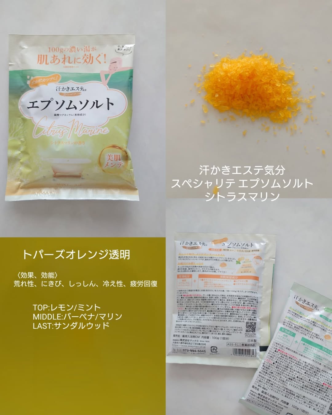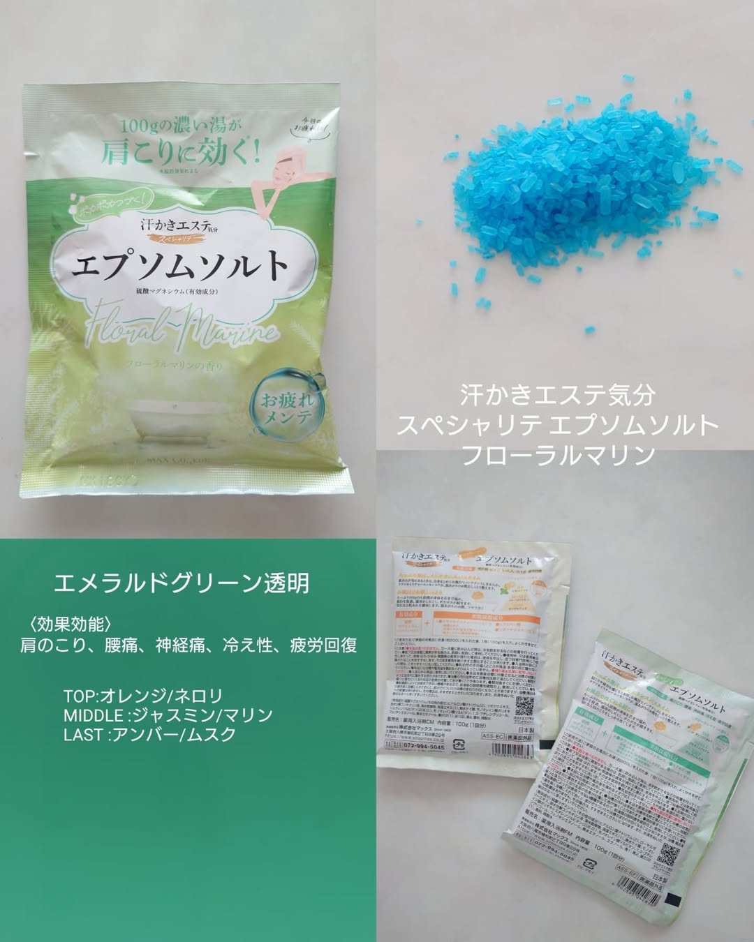 𓈒𓂃𓈒𓇼𓈒𓂃𓈒 お風呂時間をより豊かにしてくれるのが入浴剤。 入浴剤入れないお風呂なんて考えられないくらい 「今日は何入れようかな♪」と悩む時間も好き。 大好きな汗かきエステ気分に スペシャリテエプソムソルトシリーズが 出てました✨️ バスソルトもエプソムソルトも好きだから 最高の組み合わせすぎる〜。 𓈒𓂃𓈒𓇼𓈒𓂃𓈒 □汗かきエステ気分 スペシャリテエプソムソルト シトラスマリン 有効成分 硫酸マグネシウム(エプソムソルト)と 美肌保湿成分として、 テラスモイスチャーエッセンス※、 ヒアルロン酸、ツボクサエキス(CICA) が配合されています。 ※海藻エキス、真珠エキス、海水ミネラル(海水乾燥物) 〈効果効能〉 荒れ性、にきび、しっしん、冷え性、疲労回復 🍋シトラスマリンの香り TOP : レモン/ ミント MIDDLE:バーベナ/ マリン LAST :サンダルウッド トパーズオレンジのお湯色で、 爽やかな香り。 お風呂上がりは、お肌がしっとり。 ポカポカになりました♨ □汗かきエステ気分 スペシャリテ エプソムソルト フローラルマリン 有効成分 硫酸マグネシウム(エプソムソルト)と 美肌保湿成分として、 テラスモイスチャーエッセンス※、 ヒアルロン酸、ローヤルゼリーエキス が配合されています。 ※海藻エキス、真珠エキス、海水ミネラル(海水乾燥物) 〈効果効能〉 肩のこり、腰痛、神経症、冷え性、疲労回復 ❀フローラルマリンの香り TOP:オレンジ/ ネロリ MIDDLE :ジャスミン/マリン LAST: アンバー/ ムスク エメラルドグリーン透明のお湯色で 甘くて爽やかな心地よい香り。 かなりポカポカでじんわり汗ばむくらい♨ お風呂上がりはお肌しっとり。 𓈒𓂃𓈒𓇼𓈒𓂃𓈒 香りがとにかく良い香りで、 冷え性でなかなか汗をかかないけれど じんわり汗をかくくらいポカポカに♨ お風呂上がりは心地よい疲労感とスッキリ感。 良いお風呂でした♨ 𓈒𓂃𓈒𓇼𓈒𓂃𓈒 #PR #株式会社マックス #汗かきエステ気分 #汗かきエステ #入浴剤 #バスソルト #バスタイム #お風呂グッズ #マックス石鹸 #マックスコスメ #マックスコスメオンラインショップ #エプソムソルト #肩こりに効く #半身浴 #肌あれに効く #monipla #soapmax_fan