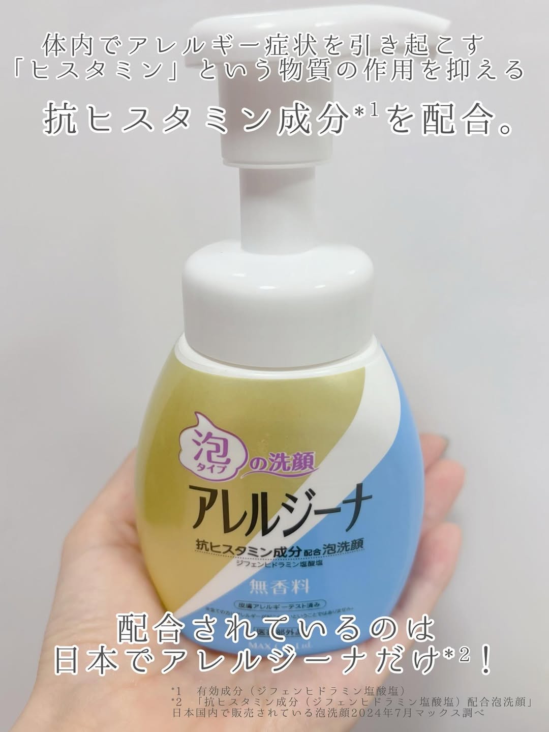 株式会社マックス様からアレルジーナを提供していただきました。 アレルジーナ 泡洗顔 価格:990円(税込) 体内でアレルギー症状を引き起こす「ヒスタミン」という物質の作用を抑える抗ヒスタミン成分*1を配合している泡洗顔。 日本で唯一配合*2なのも嬉しいポイント。 ふわふわした柔らかい弱酸性泡が肌を包み込んでくれる。 さっぱりした洗い上がりなので、朝に〇 乾燥が気になる時もあったから保湿はしっかりするのがおすすめ! 湿疹や炎症を伴うムズカユ肌には使えないから注意⚠️ *1有効成分(ジフェンヒドラミン塩酸塩) *2「抗ヒスタミン成分(ジフェンヒドラミン塩酸塩)配合泡洗顔」日本国内で販売されている泡洗顔2024年7月マックス調べ #PR #株式会社マックス #アレルジーナ #洗顔 #泡洗顔 #敏感肌 #乾燥肌 #フェイスケア #スキンケア #洗顔フォーム #洗顔料 #マックス石鹸 #マックスコスメ #monipla #soapmax_fan