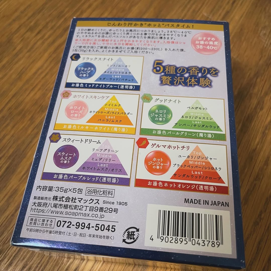 バスソルト汗かきエステ気分 5種類入っていています こんな方にオススメ ・しっかりお風呂に入って汗をかきたい ・お肌をひきしめたい ・お風呂で美しくなりたい ・気分転換したい 使ってみた感想 じわじわ汗をかくし リラックスできました。 あと香りも良くて、出た後にも体に匂いかついていて良かったです。 #PR #株式会社マックス #汗かきエステ気分 #汗かきエステ #バスソルト #入浴剤 #入浴 #お風呂 #お風呂グッズ #マックス石鹸 #マックスコスメ #monipla #soapmax_fan