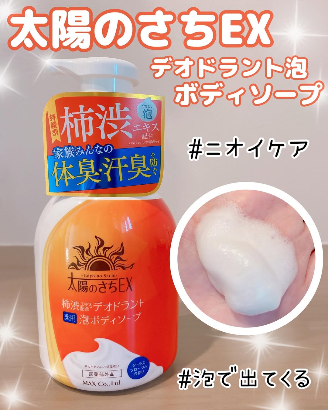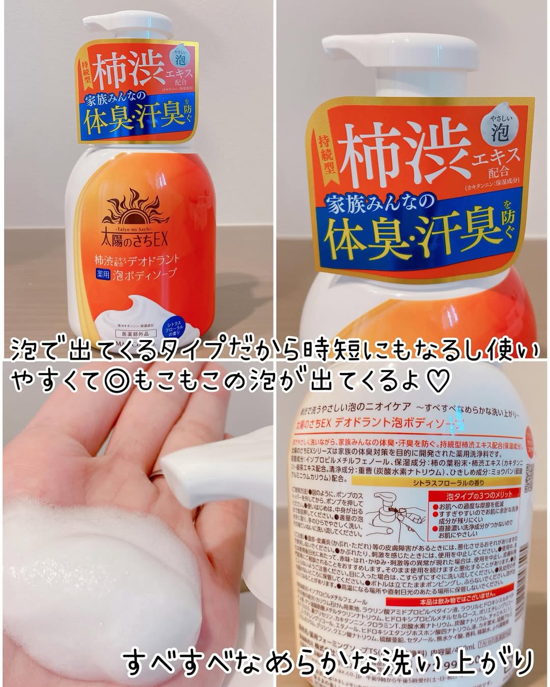 ♡ @maxcosme1905 さまの ˗ˏˋ 太陽のさちEX 泡ボディソープˎˊ˗ お試しさせていただきました🤍 柿渋*で洗うやさしい泡のニオイケア ~すべすべなめらかな洗い上がり~ 泡タイプで使いやすいボディソープ!✨ 泡タイプのいいところは ☑︎お肌への過度な摩擦を軽減 ☑︎すすぎやすいのでお肌に余計な成分が残りにくい ☑︎直接濃い洗浄成分がつかないのでお肌にやさしい 泡立てる手間がなくもこもこの泡が出てくるから嬉しい☺️🤍 シトラスフローラルの香りがとってもさわやかで本当にいい香り!! お風呂の時間が待ち遠しくなる香りです〜🛀🫧 洗い上がりがすべすべなのでとっても気持ちよくて体を洗うのが楽しくなりました✨ 体臭ケアにももってこいなので我が家の男性陣(旦那・長男)に優先的に使ってもらってます✊🏻笑 気になった方はぜひ試してみてね🌈 ありがとうございました🤍 *カキタンニン:保湿成分 #PR #株式会社マックス #太陽のさち #デオドラント #泡ボディソープ #ボディソープ #柿渋 #ニオイケア #体臭ケア #薬用ボディソープ #ボディケア #マックス石鹸 #マックスコスメ #monipla #soapmax_fan