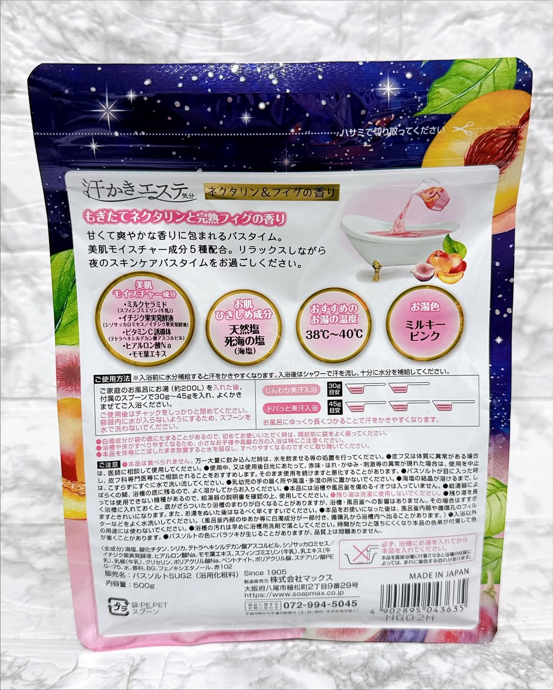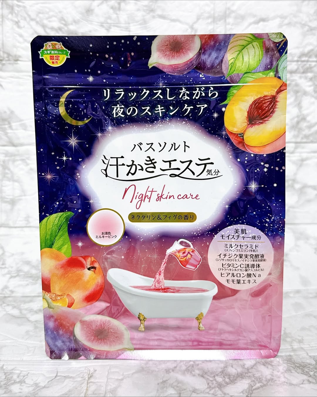 •*¨*•.¸¸☆*・゚ 《スギ薬局限定》 汗かきエステ気分 ナイトスキンケア ネクタリン&フィグの香り 夜のお風呂を“ながら美容タイム”に🛁✨ まるでエステのようにじんわり汗をかきながら、 肌をなめらかに整えてくれるナイトケア入浴剤💆♀️ ミネラル豊富なソルトと保湿成分が 毛穴汚れや余分な皮脂をすっきり落としつつ、 お風呂上がりの肌はしっとりツルもち。 発汗しながら肌を柔らかくして、 その後のスキンケアのなじみもぐっと良くなる感じ🫧 ▷じんわり美汗入浴には30g ▷ドバっと美汗入浴には45g 入浴剤の量で調節できるのが嬉しい🐻❄️ もちろん軽量スプーンは付属されてるから ささっと湯船に入れるだけでOK︎👌🏻 ̖́- そして何より… ネクタリン&フィグの香りが最高に癒される🍑 ピーチ系大好き民は全員スギ薬局へ急いで!笑 みずみずしい果実の甘さがたーーーっぷりと ほんのり爽やかさ、大人っぽさもあって… 1日の疲れがふわっとほどけるような香りが好き。 冷えが気になるこれからの季節にもぴったりで、 おうちでエステ気分を楽しめる“温活美容アイテム” 私は冬は入浴剤必須だと思ってるタイプなので この汗かきエステシリーズも大好きだから 何回も香りを変えてリピ買いしてるんだけど… 1番好きです(*´艸`)フフフッ これは定番化してほしいなぁ…💗 ✒️_公式Instagram @maxcosme1905 ______________________________ #PR #株式会社マックス #汗かきエステ気分 #バスタイム #お風呂 #汗かき #バスソルト #ネクタリンフィグ #汗かきエステ #入浴剤 #スギ薬局 #スギ薬局限定 #ネクタリン #フィグ #マックス #マックスコスメ #monipla #soapmax_fan