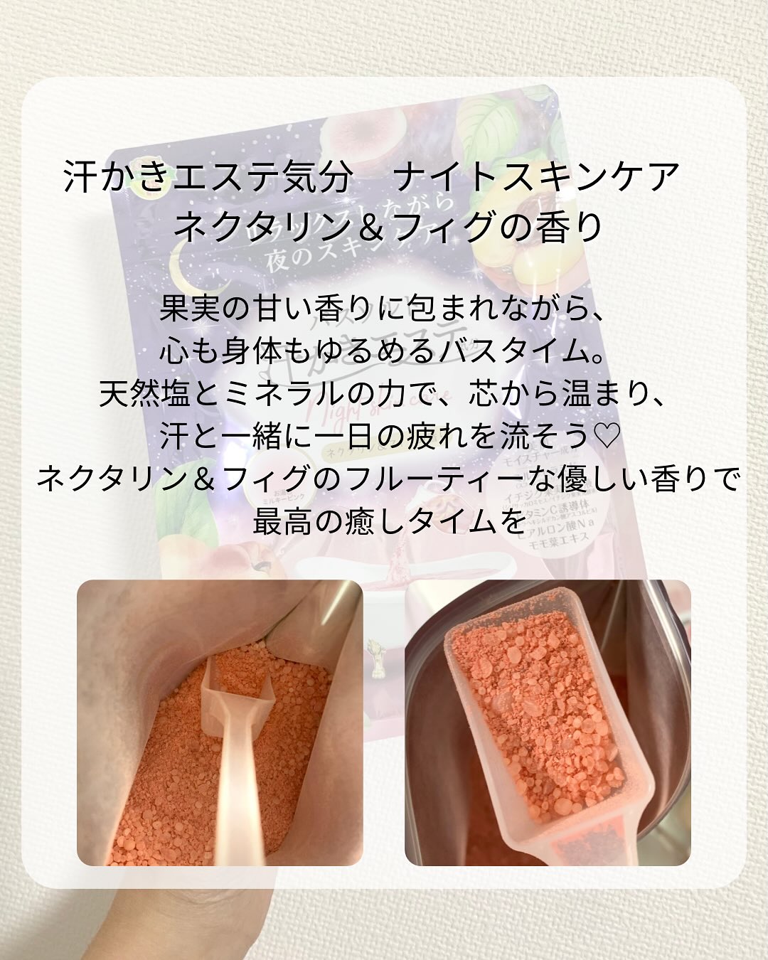 汗かきエステ気分 ナイトスキンケア ネクタリン&フィグの香り 一日の終わりに、甘くとろけるご褒美バスタイム♡ じんわりと汗が出てきてスッキリできちゃう! 発汗エステ級の温浴効果で、なめらかボディへ フルーティーで上品なネクタリン&フィグの香りに包まれて、 自宅で“汗かきエステ”体験を🥰 全国各地のスギ薬局限定だよ♩ #PR #株式会社マックス #汗かきエステ気分 #バスタイム #お風呂 #汗かき #バスソルト #ネクタリンフィグ#汗かきエステ #入浴剤 #スギ薬局 #スギ薬局限定 #ネクタリン #フィグ #マックス #マックスコスメ#monipla #soapmax_fan