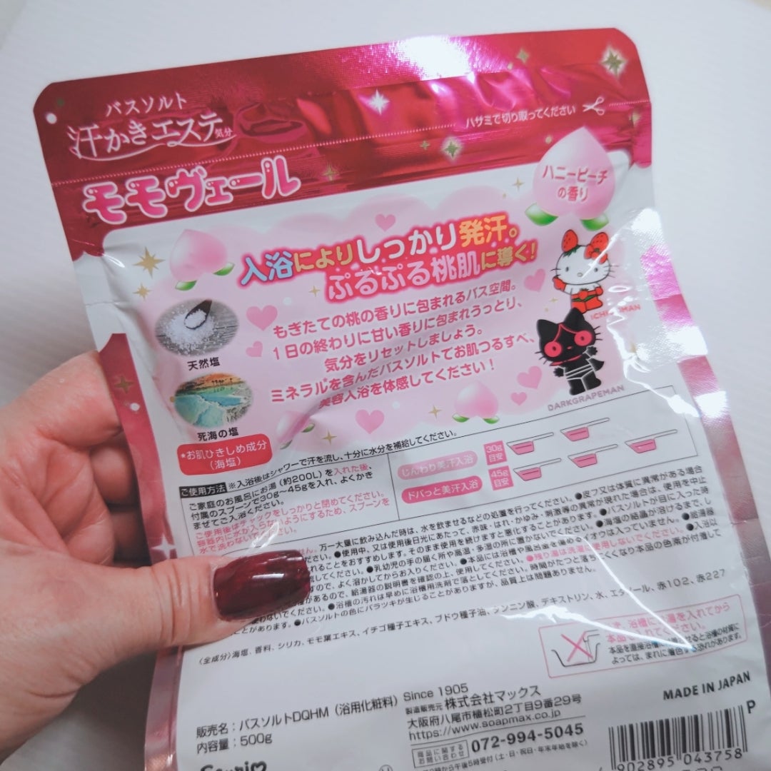 株式会社マックス様からご提供いただきました 汗かきエステ気分 モモヴェール 【ドン・キホーテ、UNY限定品】 1日の締めくくりに、ゆったりとお風呂につかりましょう。 冷えた体に温かいお風呂でホッとリラックス じんわり汗かき、お肌はつるつるスベスベ。 ミネラルを含んだバスソルトが美肌に導いてくれます。 ハニーピーチの香りです 開けた瞬間から桃の香りがフワッと香ってお風呂中が幸せ空間です ミネラルを含んだバスソルトで じんわり汗をかきつつ、お肌はスベスベになるので とってもおすすめです♪ これから寒くなるので、 お風呂時間でリラックスしたいです❤️ #PR #株式会社マックス #汗かきエステ気分 #入浴剤 #バスソルト #お風呂グッズ #サンリオ #ハニーモモ #マックスコスメ #マックス #マックスコスメオンラインショップ #ドンキ #UNY #monipla #soapmax_fan