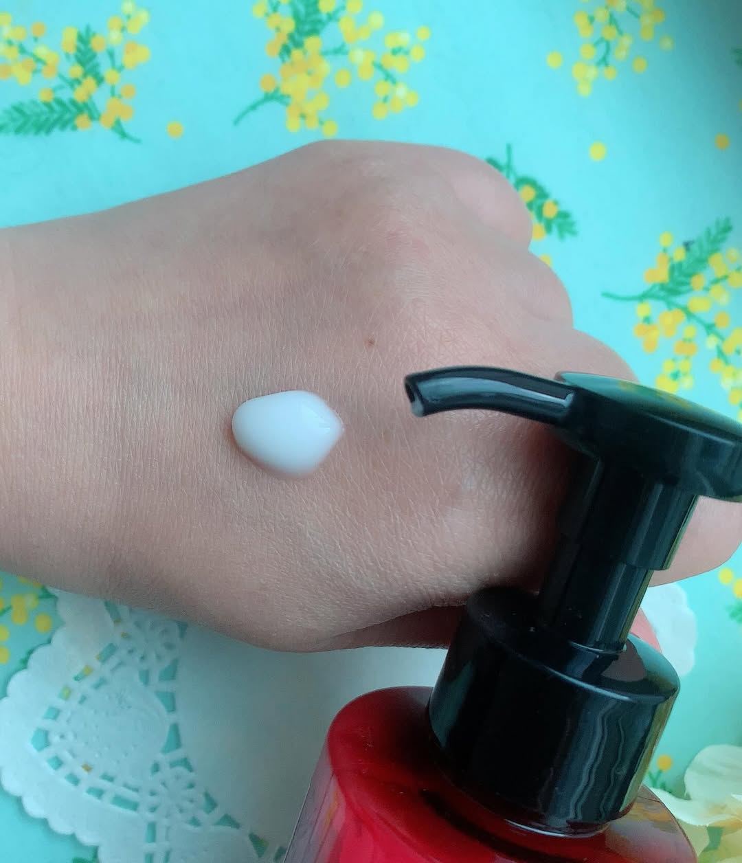 ポンプ式で出しやすく、手に取ってみると柔らかなミルクで伸びが良くさらっと馴染みます。