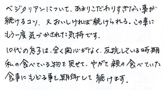 私は平成元年9月に突然肉を食べなくなりました。(原因不明でした)必ずしも主義主張や思想哲学ではなく、ある日突然、食べなくなったという事が正直な感覚です。その後の人生を振り返ってみますと平成元年という時代の変革期(昭和天皇の崩御、個人的には父が他界)に、私自身の人生もそれと呼応するようにシフトしたという気がします。この事で私の人生は間違いなく好転し、運命が変わりました。今では本当に菜食生活になった事を喜んでいます。自分自身の感性が変わってしまったのです。この喜びや感動を伝えたいという思いがこの仕事を志した動機です。