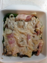 野菜が美味しい季節ですねぇ エアコンで体の芯が冷えてますから 夏でも温かい料理を食べてましょう 120円のほうれん草GET にんにくで炒めてしっかり目に味をつけます それをご飯の上に ホワイトソースの具は手切りのベーコンで食べ応えを出します チーズをたっぷりのせて 焼け… 2013/07/26