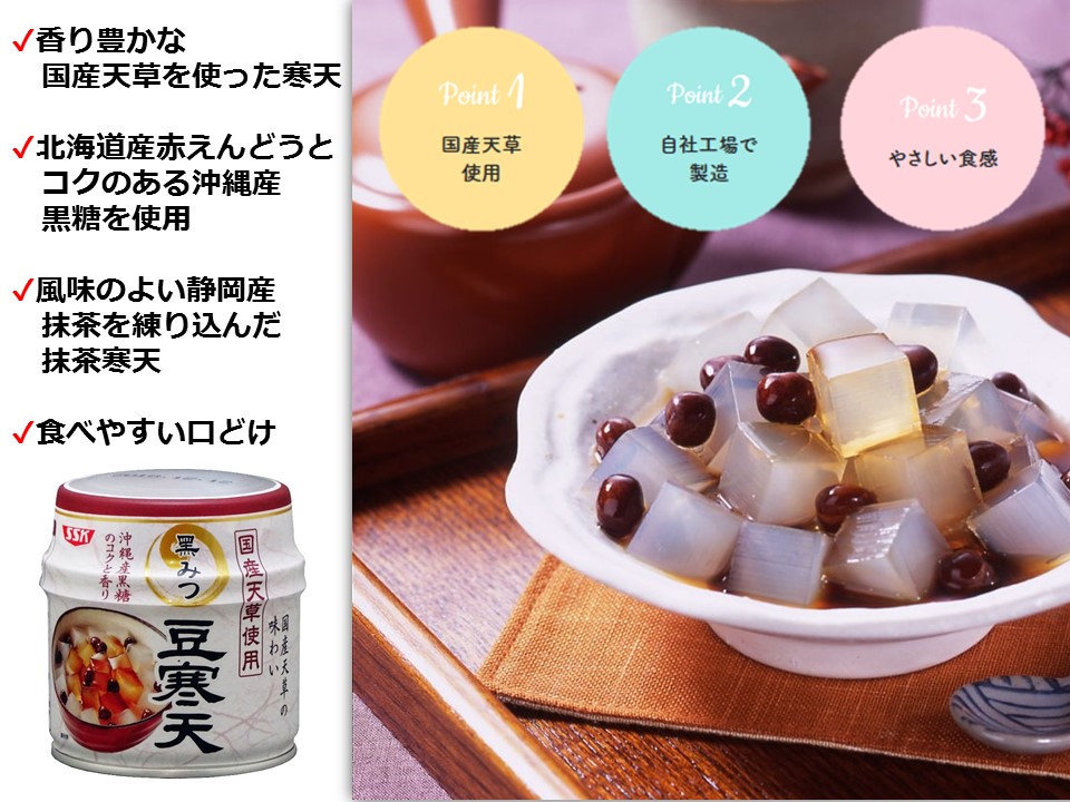 国産天草にこだわり、昔ながらの製法で寒天を作りました。北海道産赤えんどう、沖縄産黒糖を使った黒みつとの贅沢な味のハーモニーをお楽しみください。
