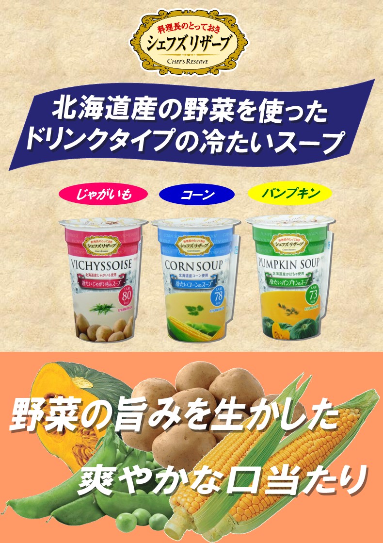 甘みの強い北海道産スイートコーンを使用。オフィスランチのサンドイッチやパスタなどに良く合います。また、忙しい朝には朝食として手軽に野菜が摂れるドリンクタイプのスープです。ストロー付きなので、いつでもどこでも召し上がれます。