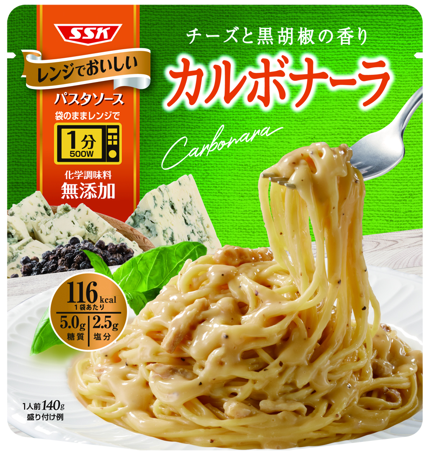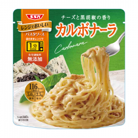 袋のまま電子レンジで約1分温めるだけ!チーズと黒胡椒の香る、濃厚でコクのあるパスタソースです。 化学調味料無添加。