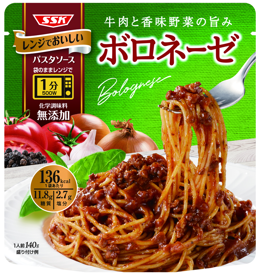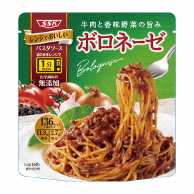 袋のまま電子レンジで約1分温めるだけ!牛肉と豚肉の旨味や香りを引き立たせた、コクのあるパスタソースです。化学調味料無添加。